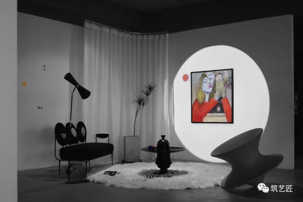 方寸之间如何让这幅作品更好的与空间融合并能得到观展观众的共识呢?我们以家庭中客厅的形式来呈现!因客厅是家人相聚共同活动的空间,这个空间中融合了每个人的喜好,个体的自由组合汇聚为整体的有序链接!
