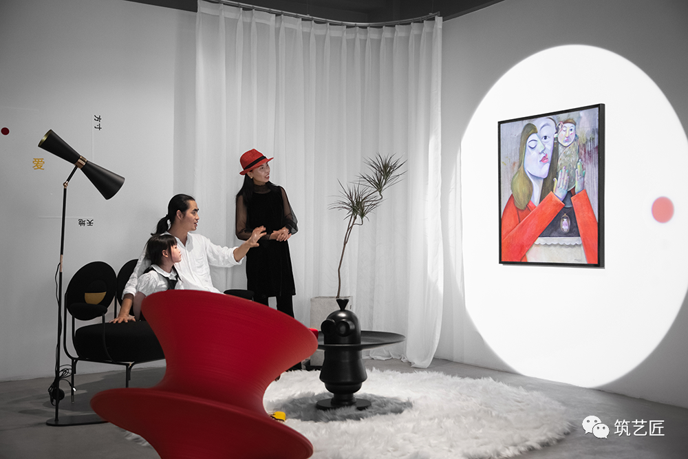 空间色彩上以画面中母亲衣服的中国红色为主题色,配以spun chair陀螺椅,让空间聚焦的同时,更有一种想要走进的有一种热情,就像母亲为家人家庭无时无刻无条件的热情奉献一样!