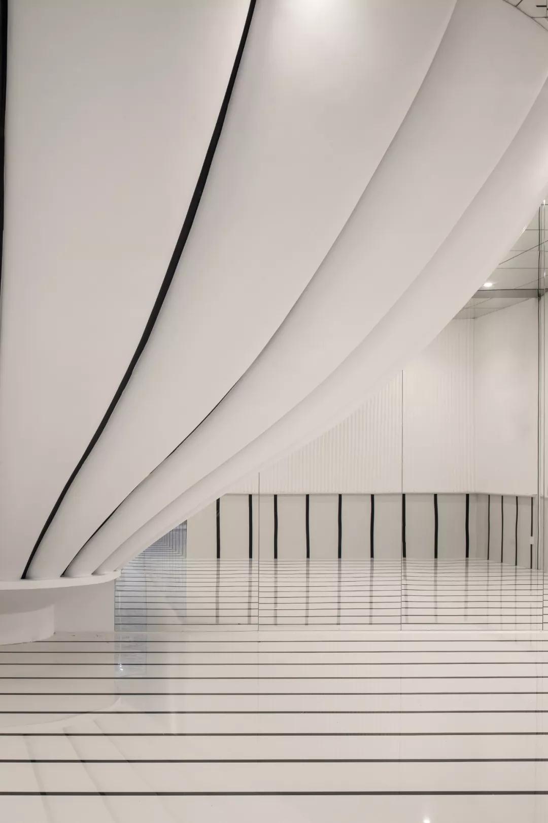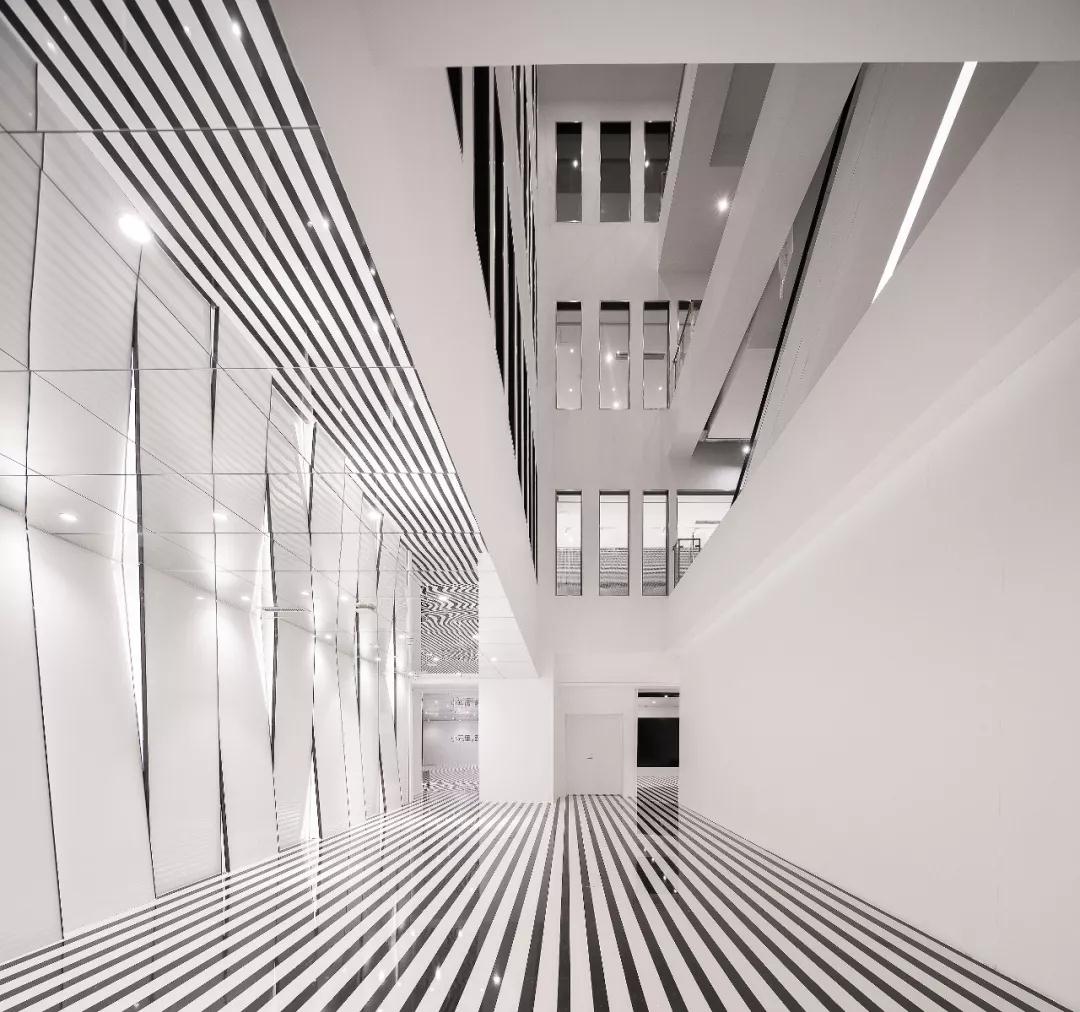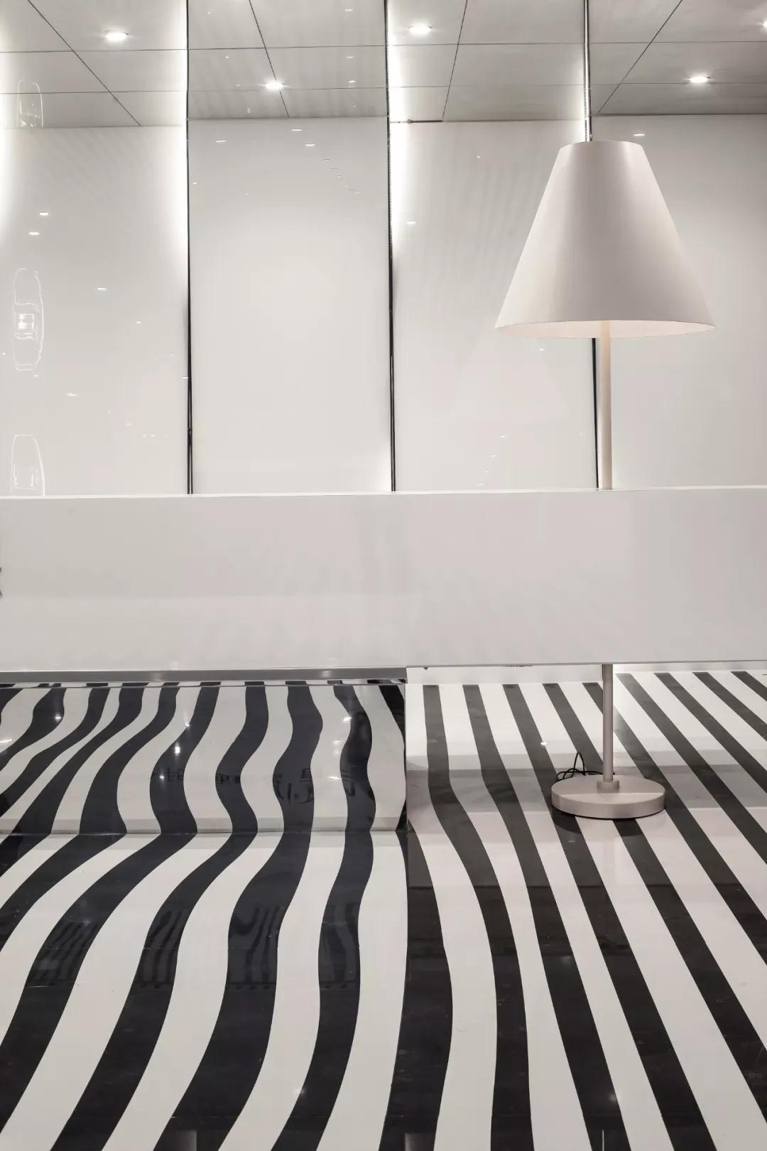 在大堂,设计师引用了水流的概念,黑白条地面水波纹的起伏,流动,象征着企业的承载和不断的前进。