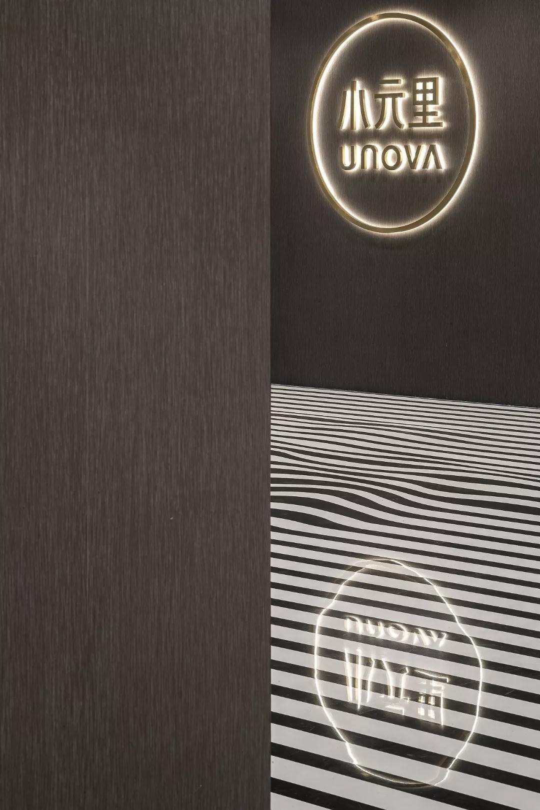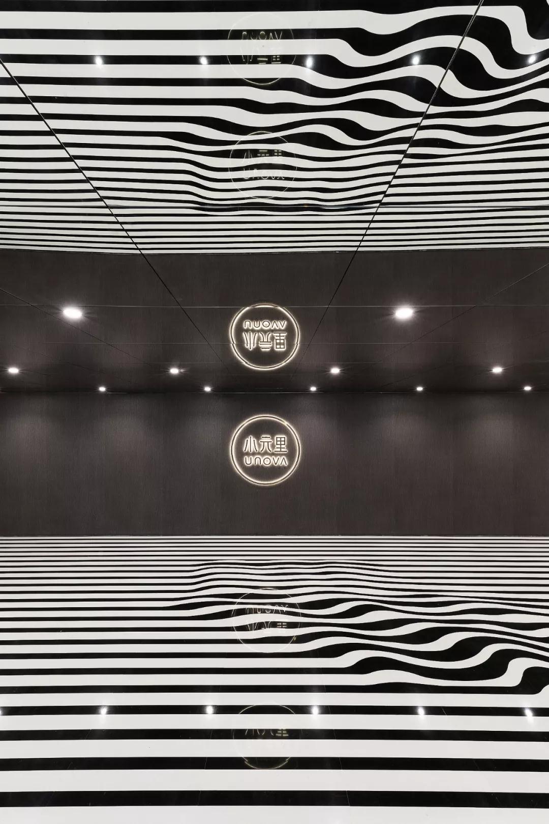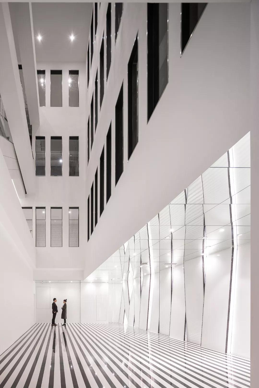 在大堂,设计师引用了水流的概念,黑白条地面水波纹的起伏,流动,象征着企业的承载和不断的前进。