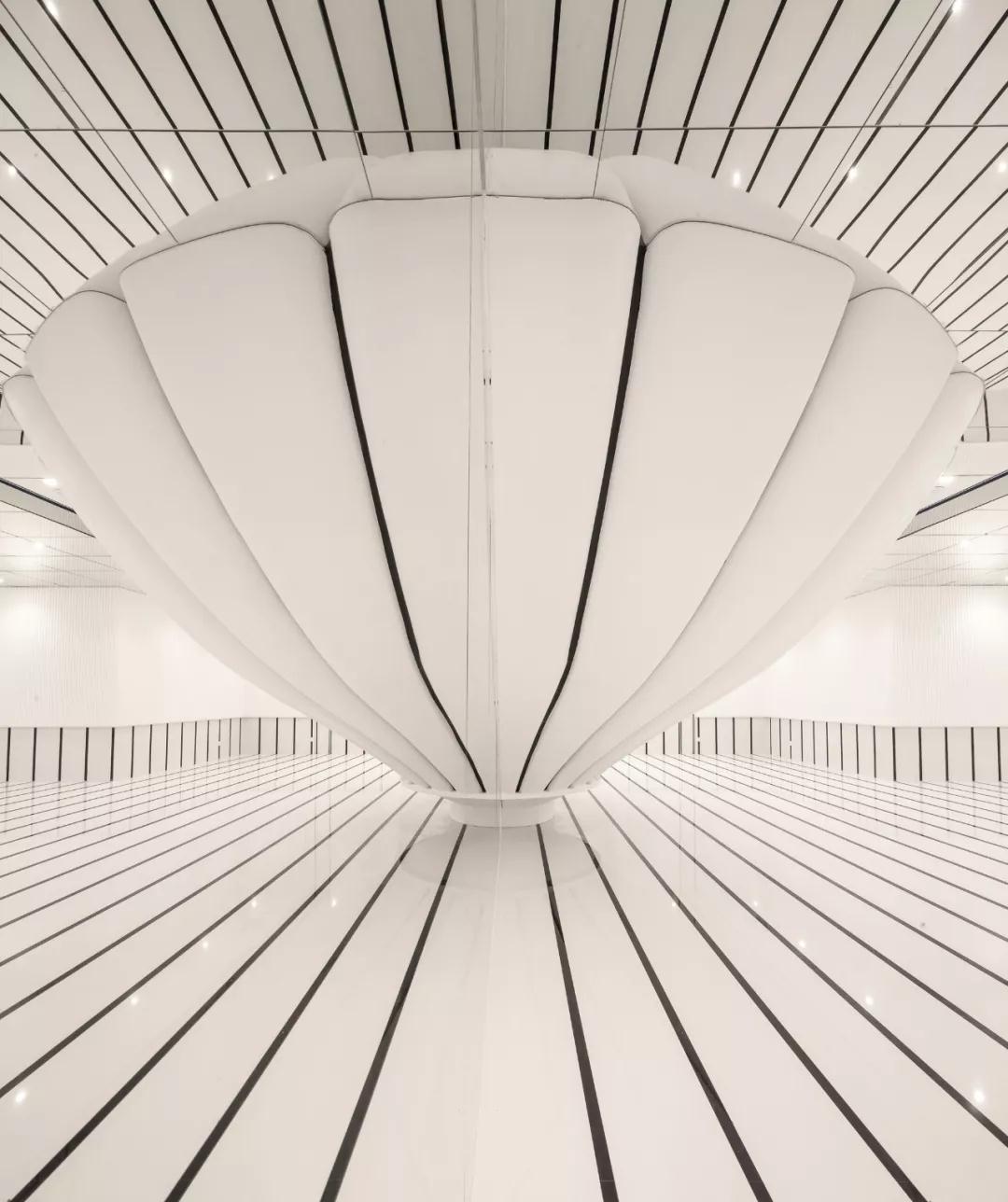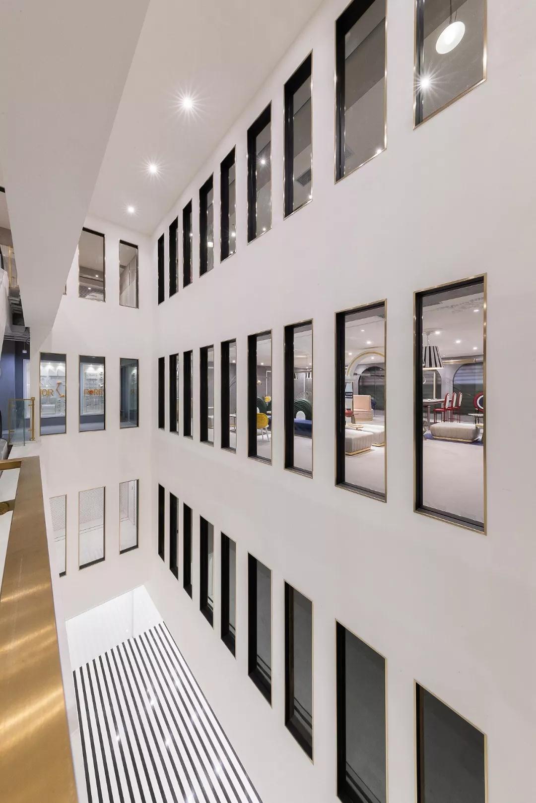 在室内,设计师特意打造了一个贯通一到四层的内中庭,把建筑的外立面窗格做在室内,让人们在室内感受室外的建筑感,并且在扶梯的上升过程中能感受一到四层不同的空间美感。