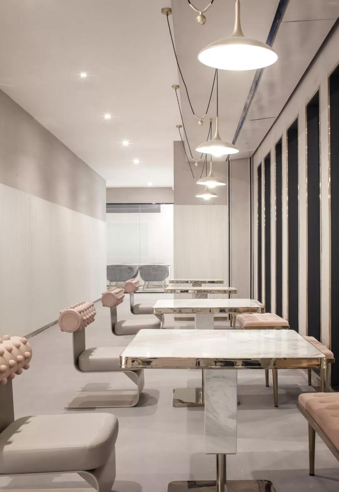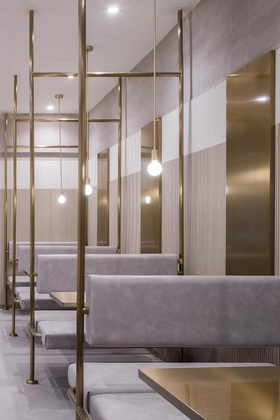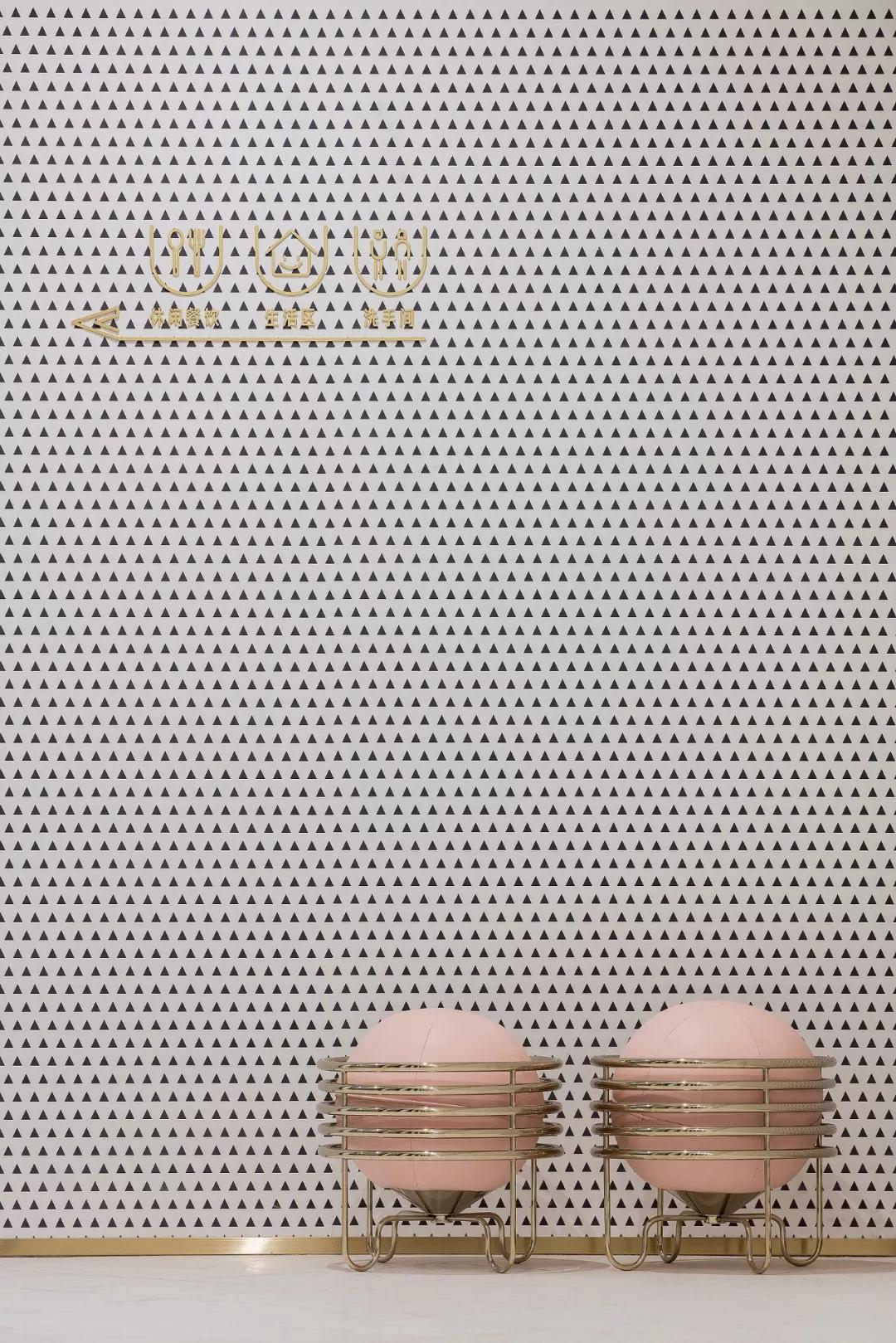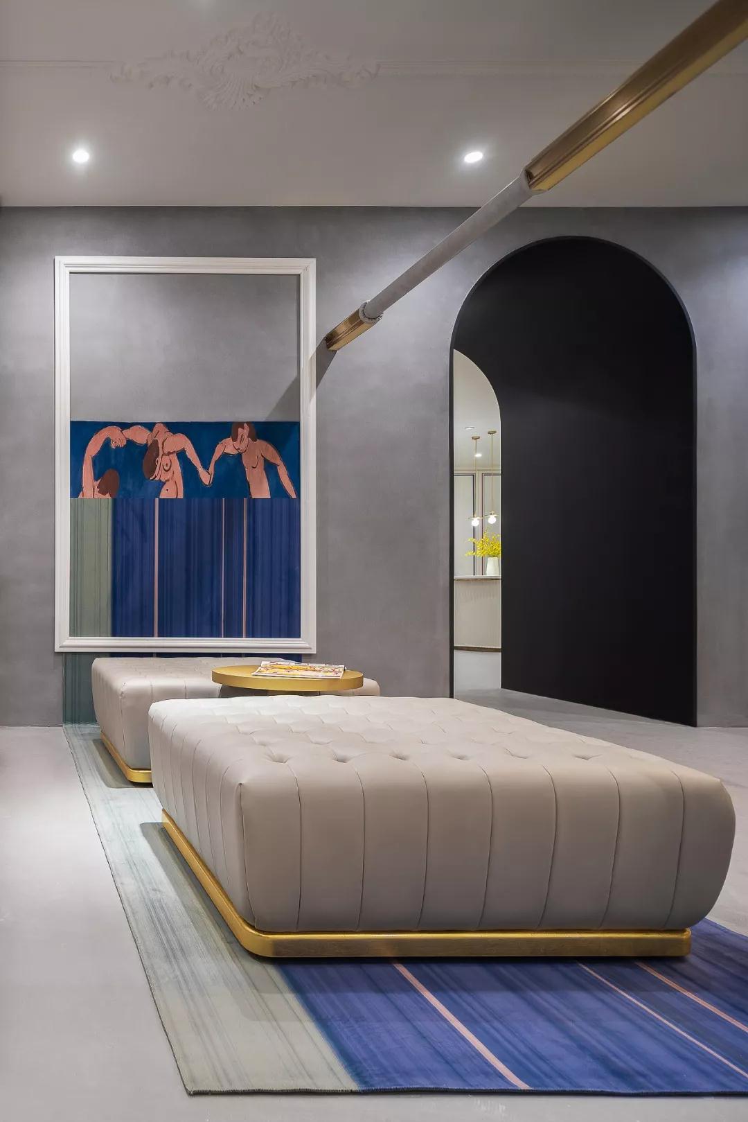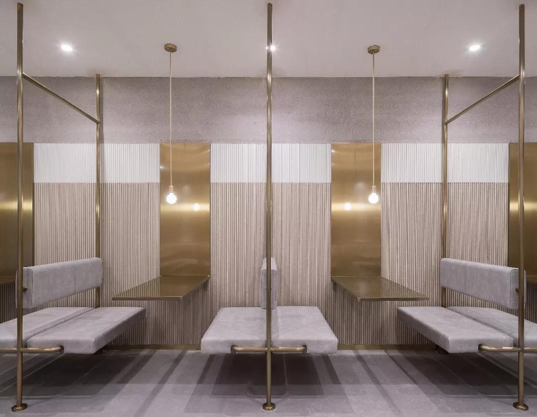 在这里,设计师引用了健身器械的元素进来,想要传达健康工作的理念。将单杠吊环意化成巨大的香槟金画框,当你穿梭其中就像置身于一幅幅画作当中。