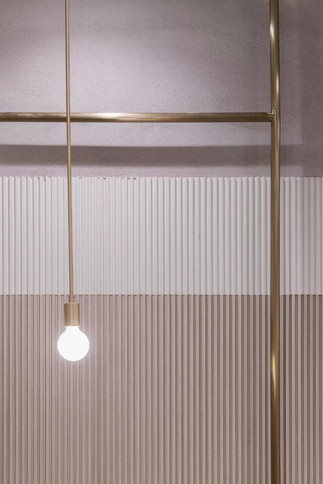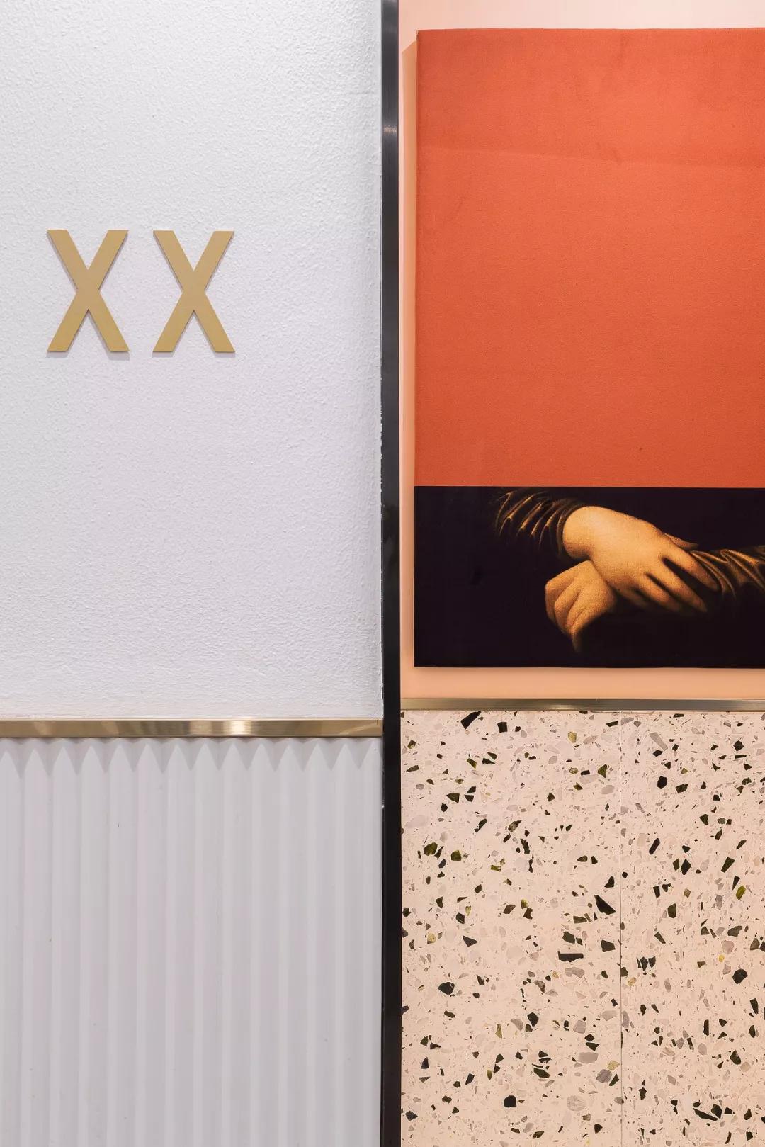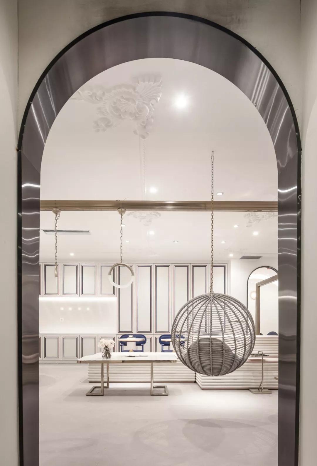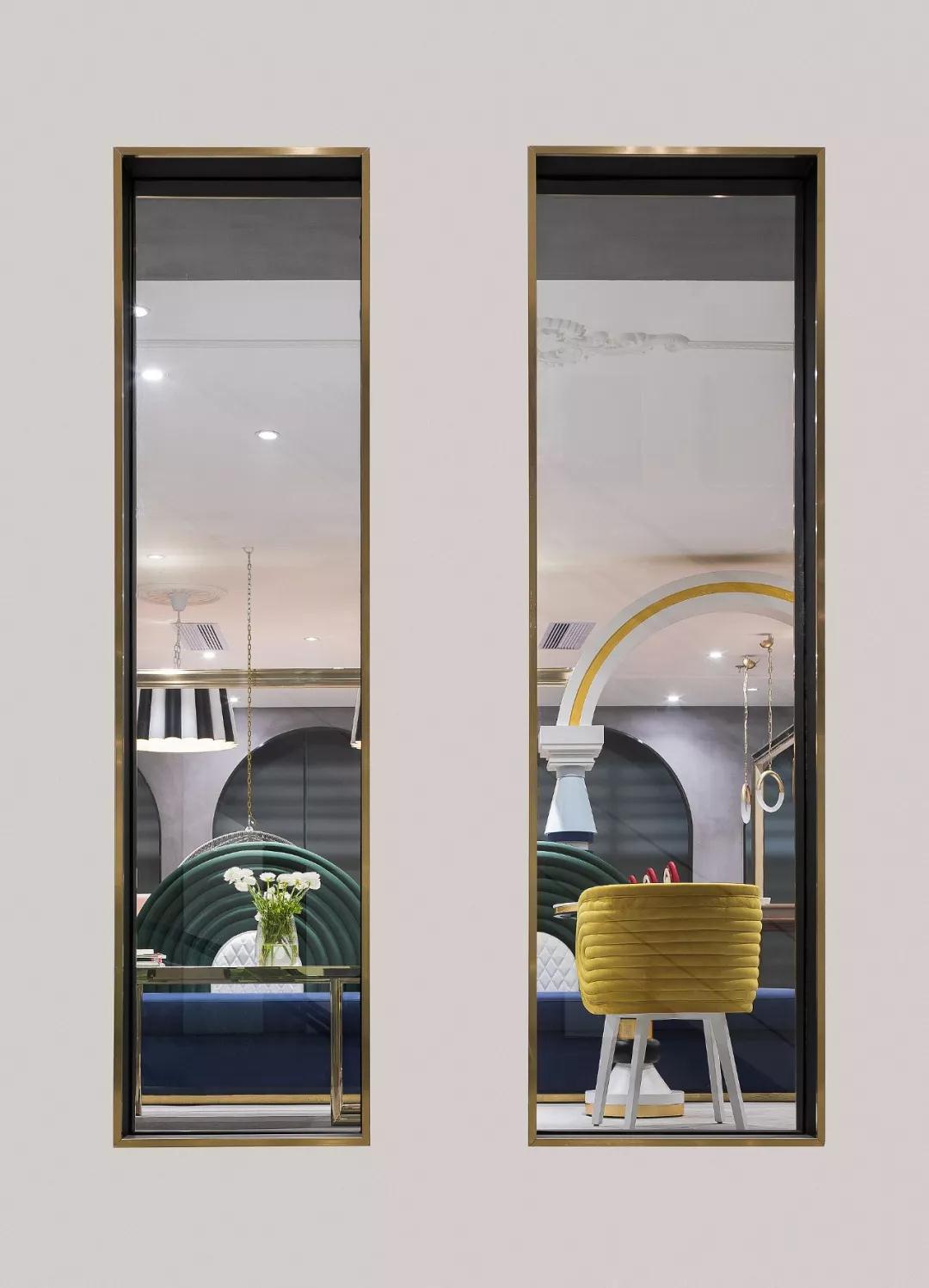 在这里,设计师引用了健身器械的元素进来,想要传达健康工作的理念。将单杠吊环意化成巨大的香槟金画框,当你穿梭其中就像置身于一幅幅画作当中。