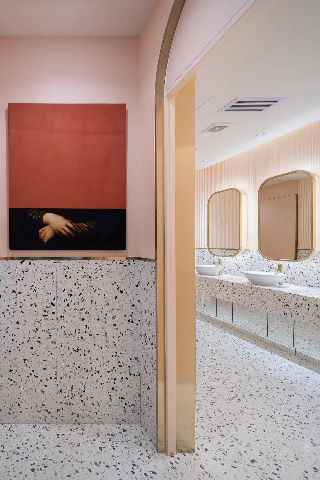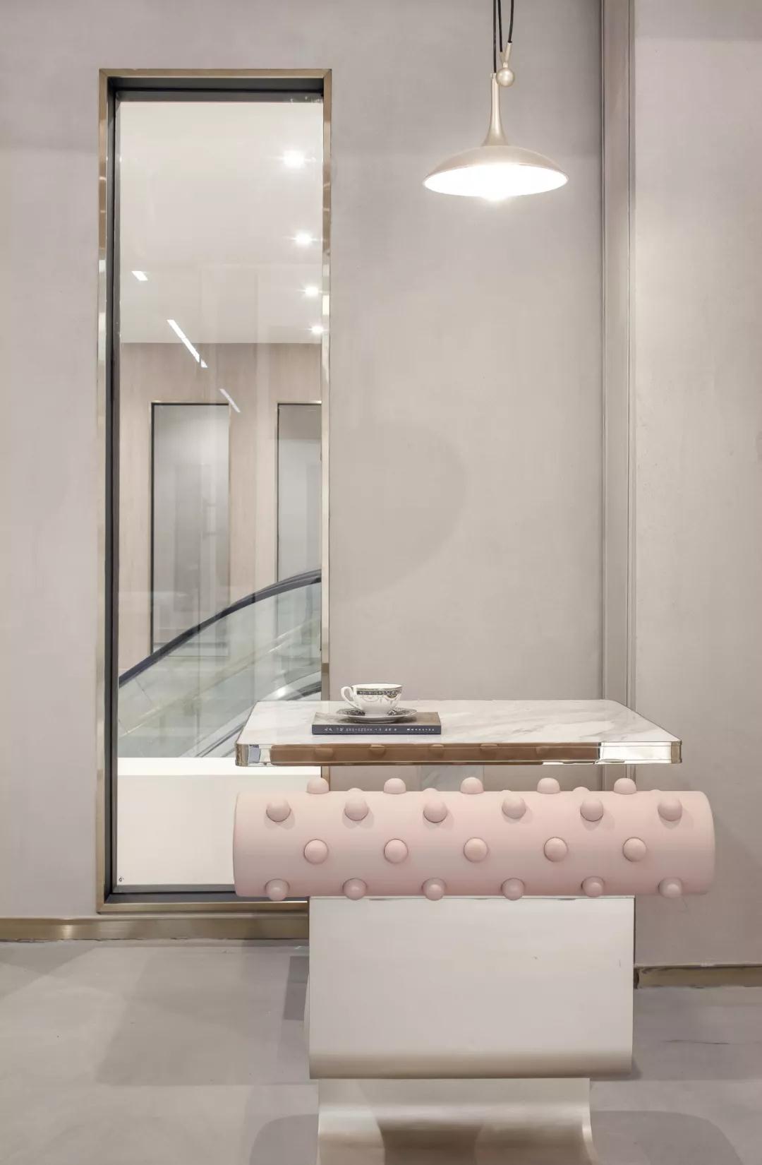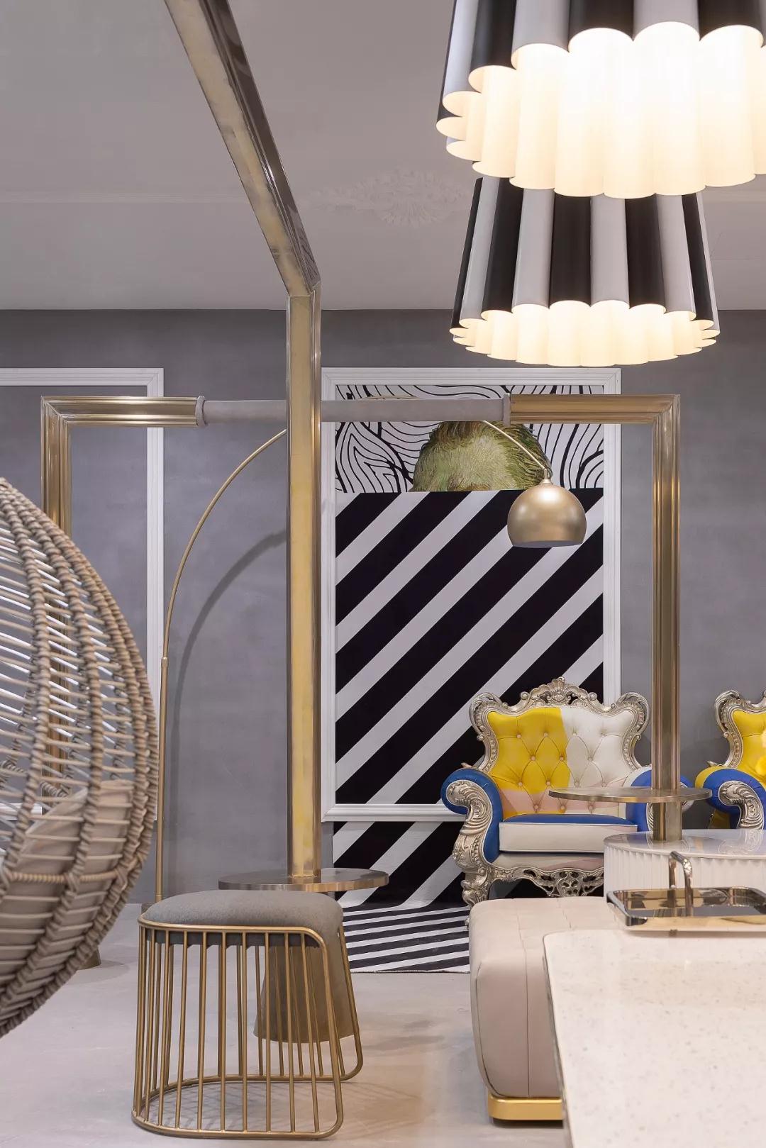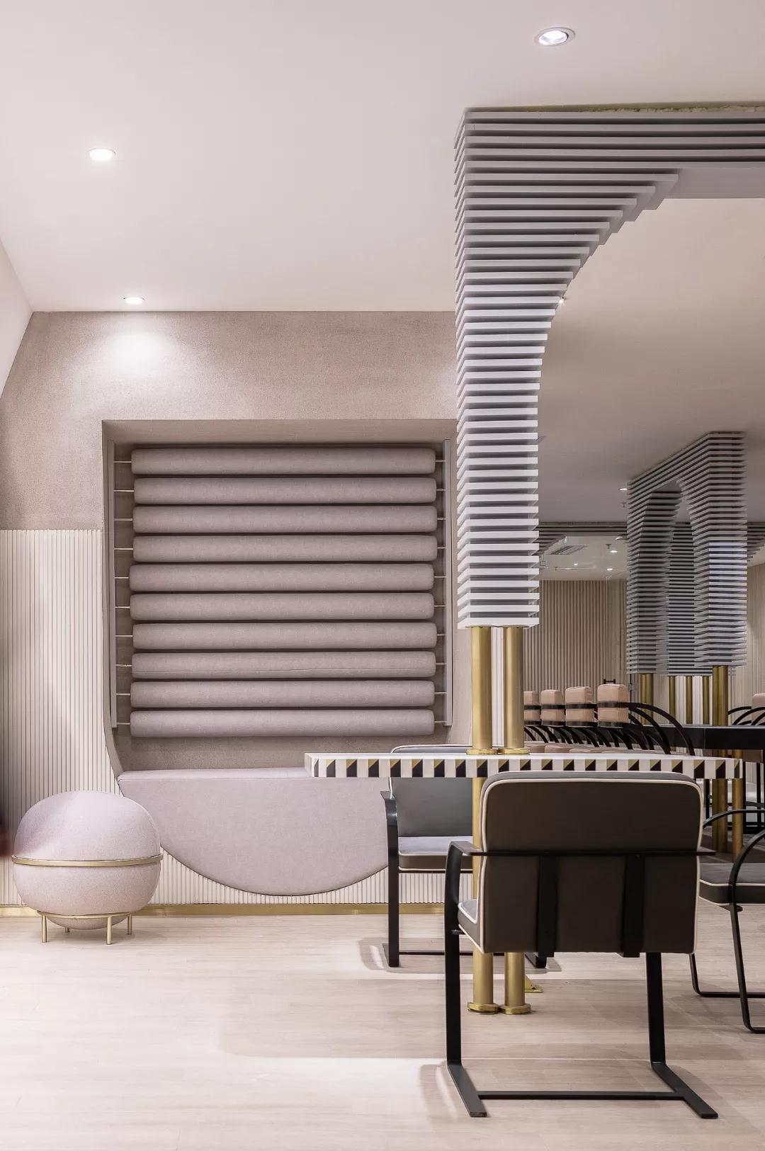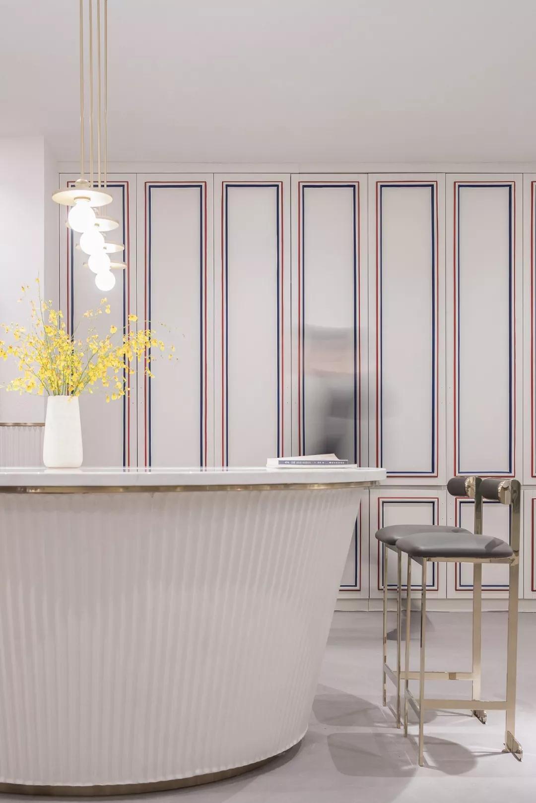 在这里,设计师引用了健身器械的元素进来,想要传达健康工作的理念。将单杠吊环意化成巨大的香槟金画框,当你穿梭其中就像置身于一幅幅画作当中。