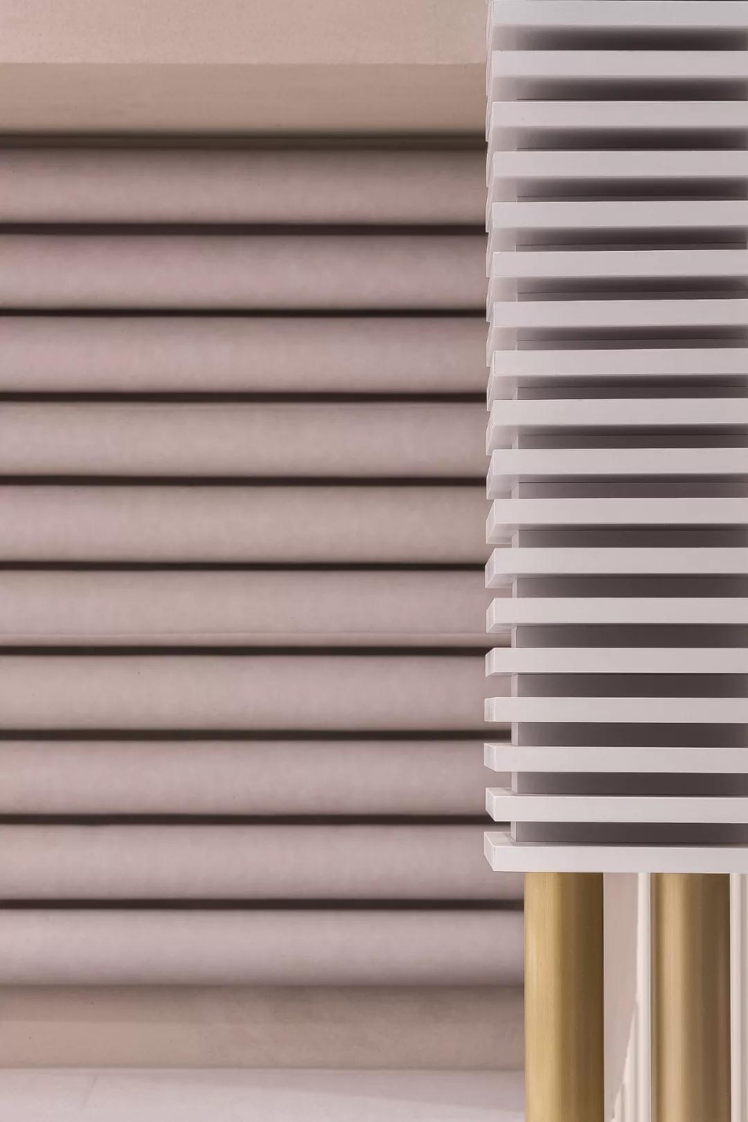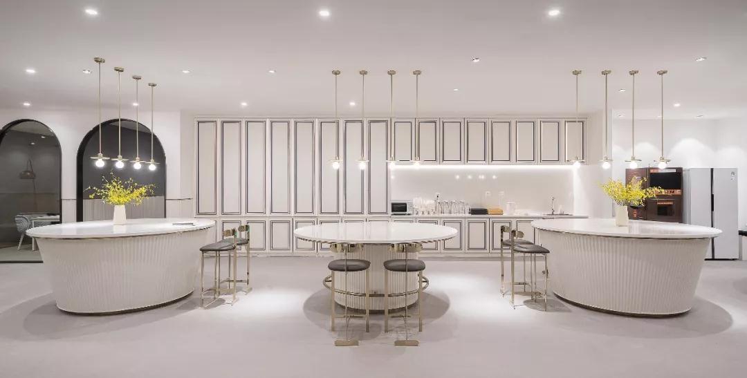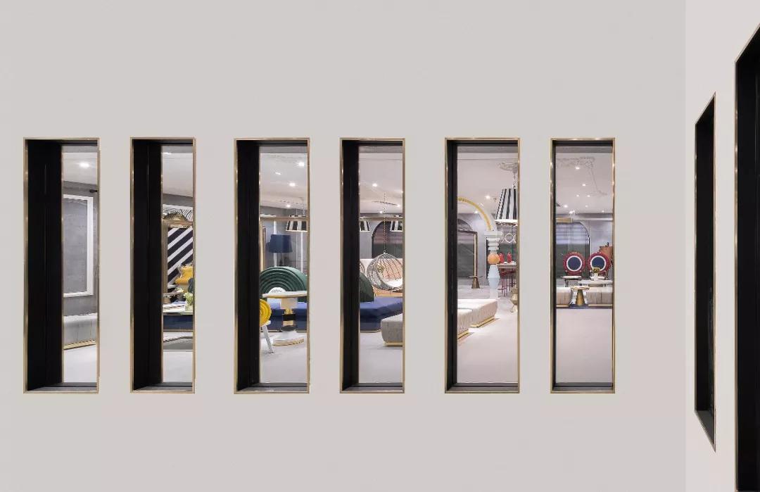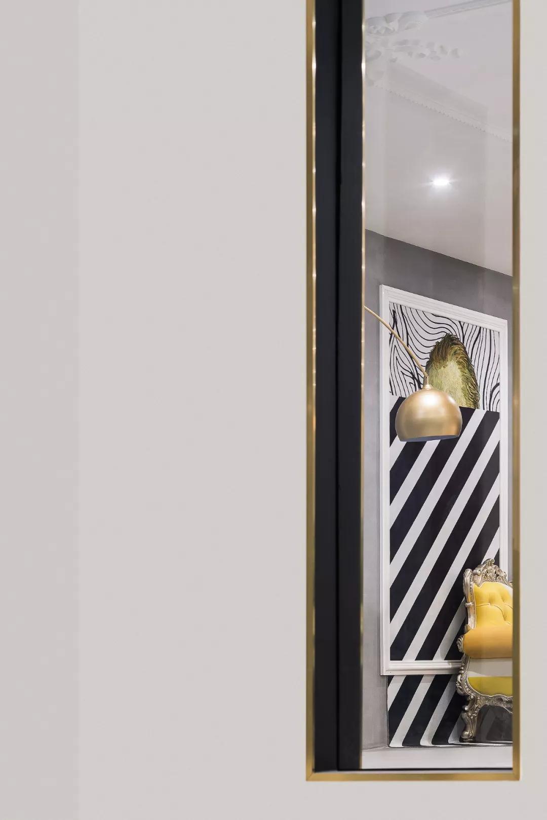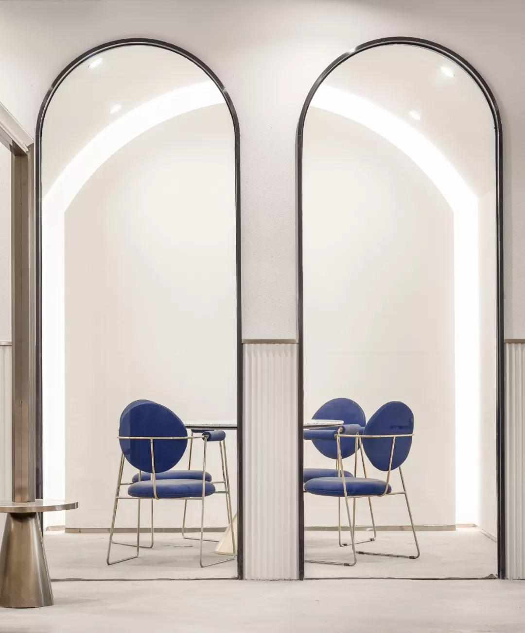 在这里,设计师引用了健身器械的元素进来,想要传达健康工作的理念。将单杠吊环意化成巨大的香槟金画框,当你穿梭其中就像置身于一幅幅画作当中。