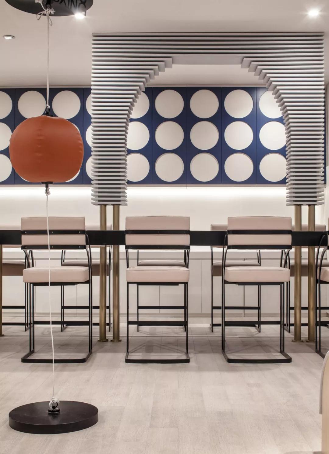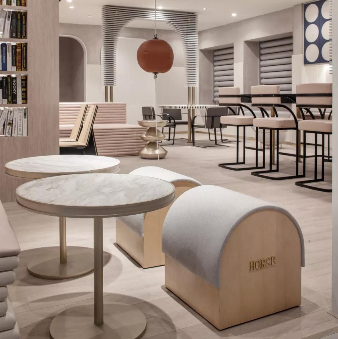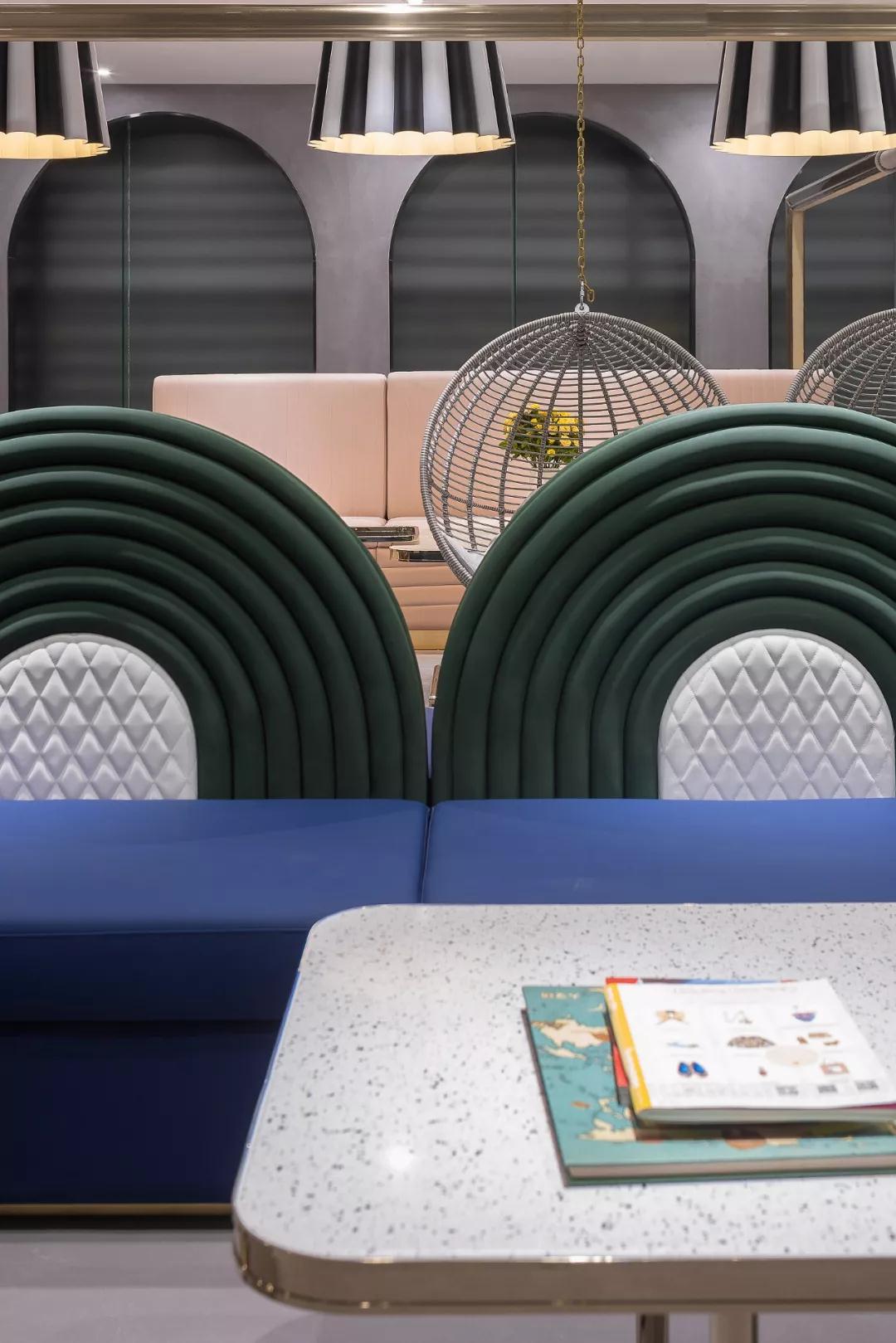 家具也不同于三楼的怪诞色彩,更偏简练沉稳。也引用了健身器械的概念,卡座和坐凳都引用了按摩椅、瑜伽球的概念,提醒人们在工作之余也能关注一下自己的身体。