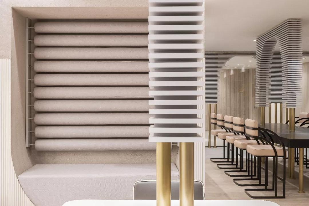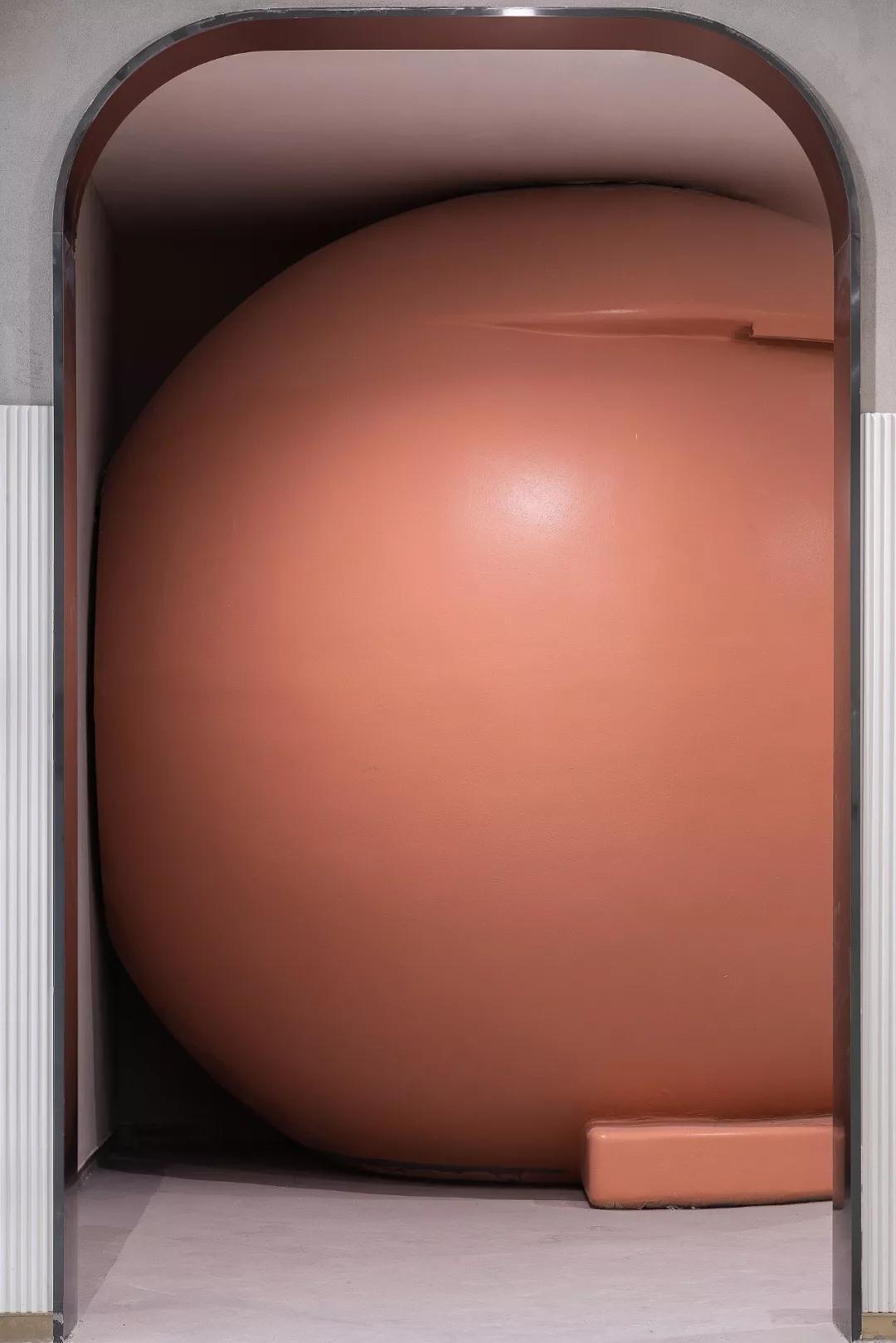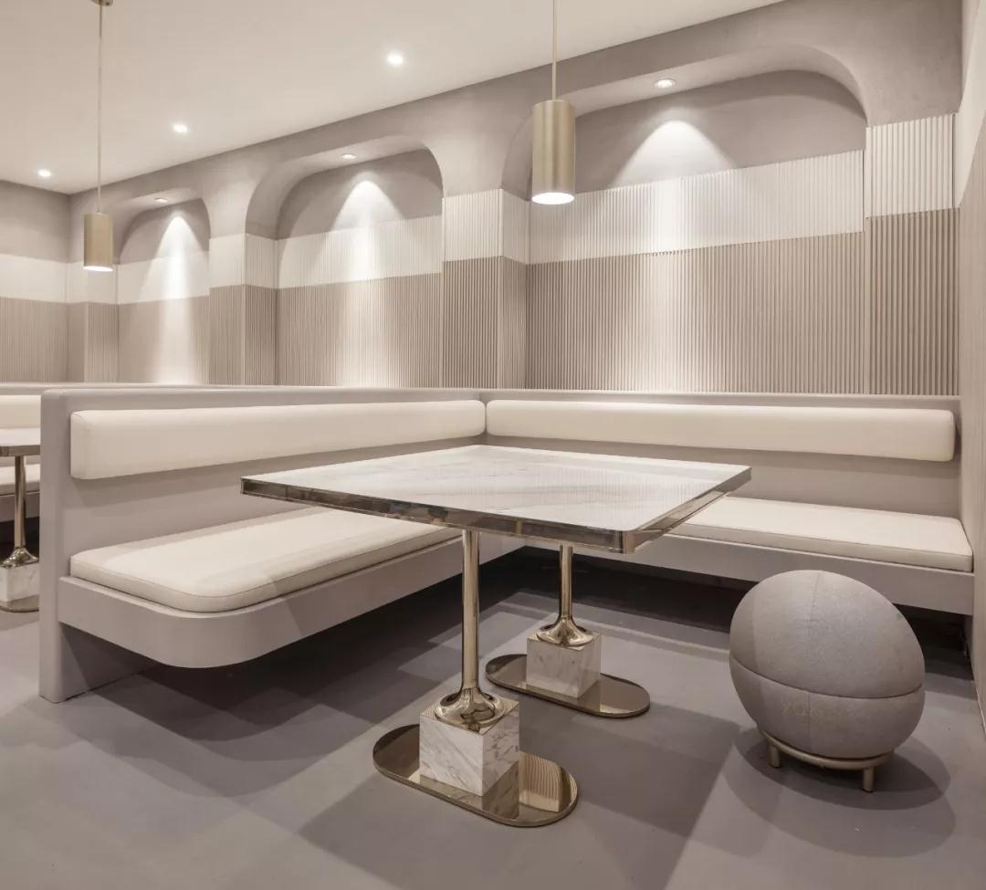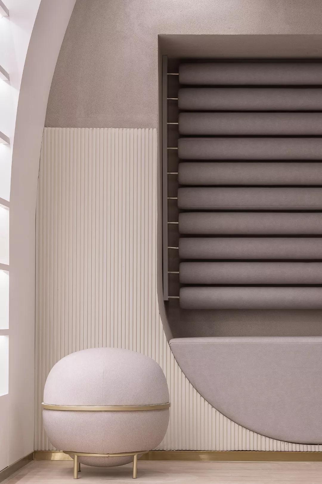 家具也不同于三楼的怪诞色彩,更偏简练沉稳。也引用了健身器械的概念,卡座和坐凳都引用了按摩椅、瑜伽球的概念,提醒人们在工作之余也能关注一下自己的身体。