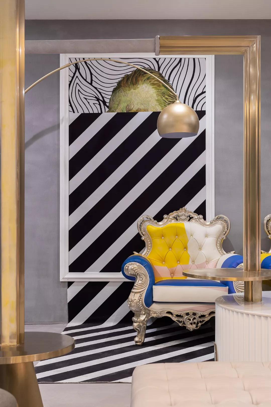 在客厅的边上是一条开放式的水吧空间,还有一个休闲玩乐的海洋球池。透过水吧区可以看到两幅怪诞的画作,梵高自画像的头部和蒙娜丽莎的手分别代表男女卫生间的标志。