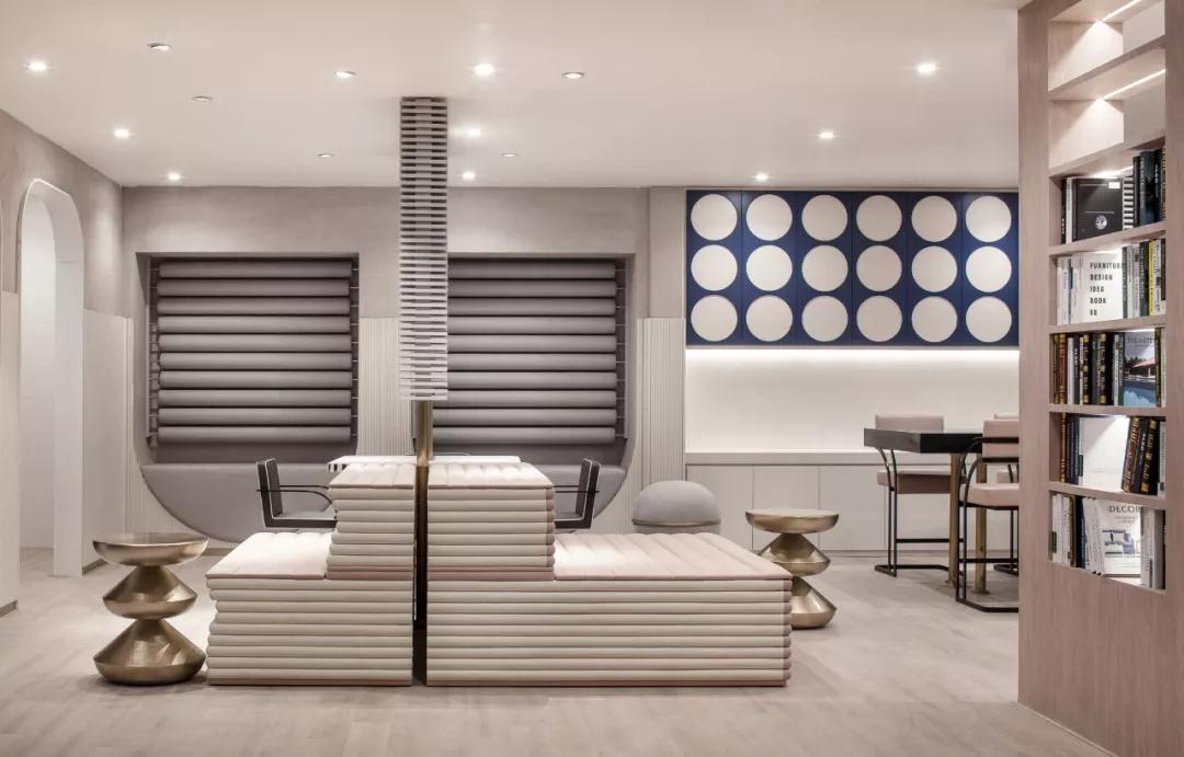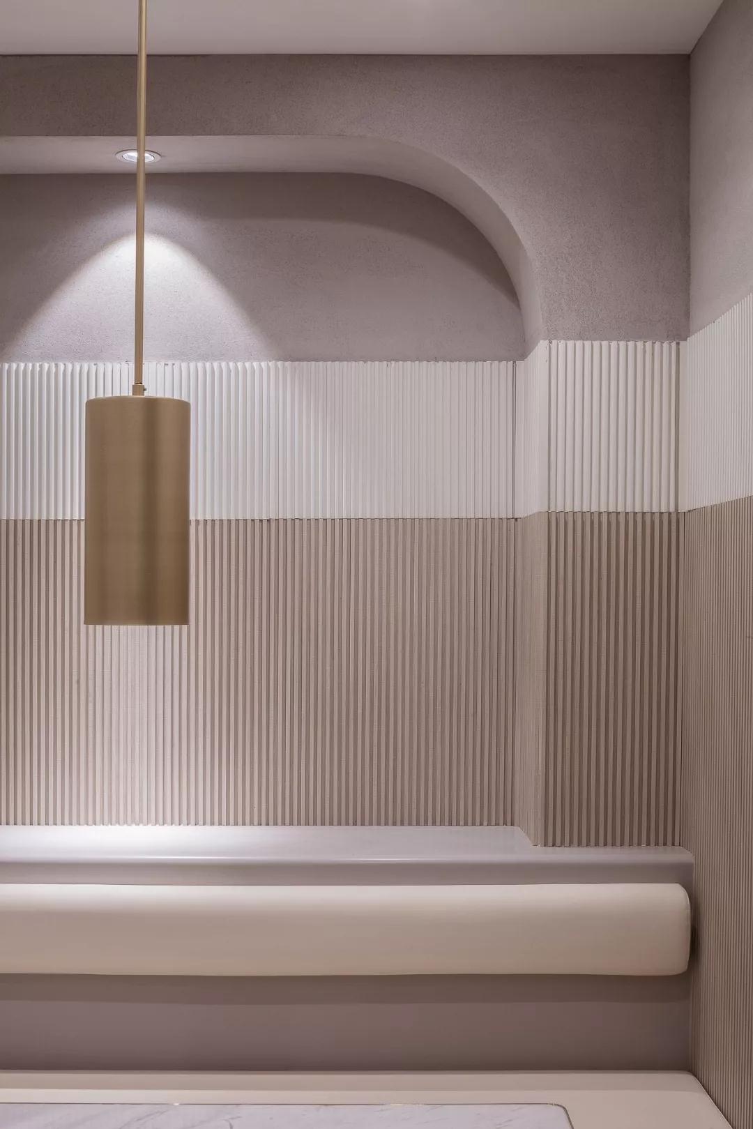 客厅区域依然采用多种的座位形式满足不同的需求,公共的水吧空间也融合在这里,同时设置相应的私密休息空间。因为针对的客群的不同,在调性上偏成熟稳重,在空间里运用比较多的木饰面和灰粽色的混凝土饰面。