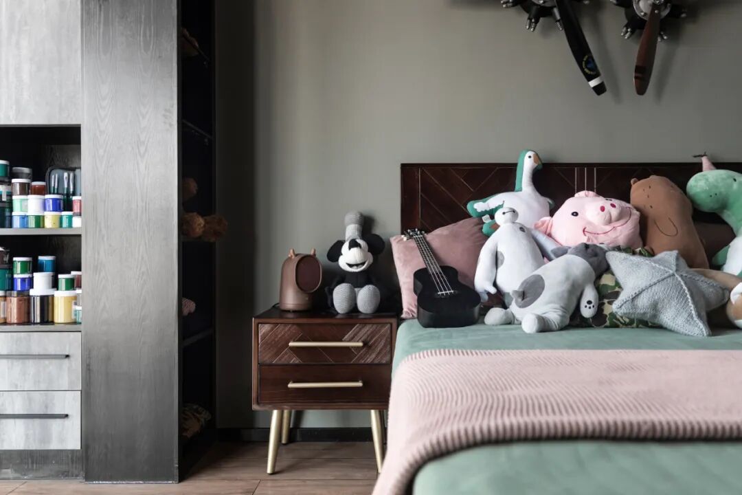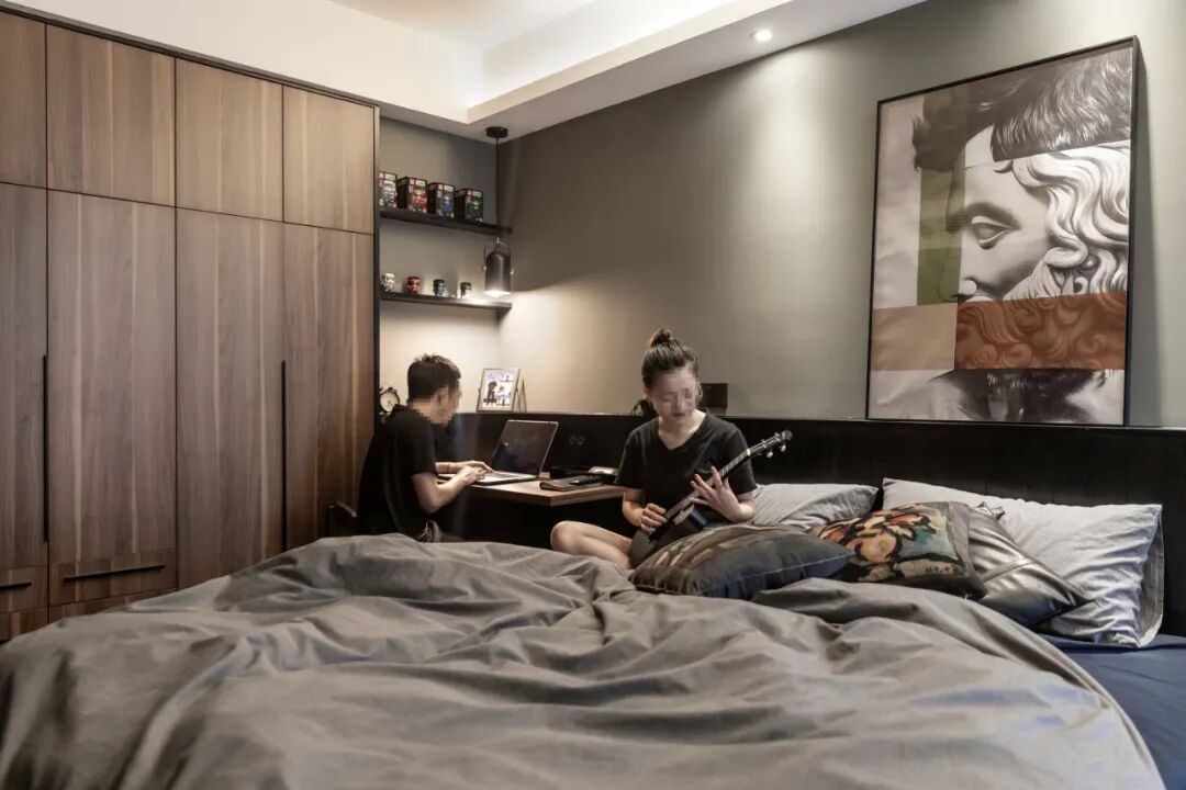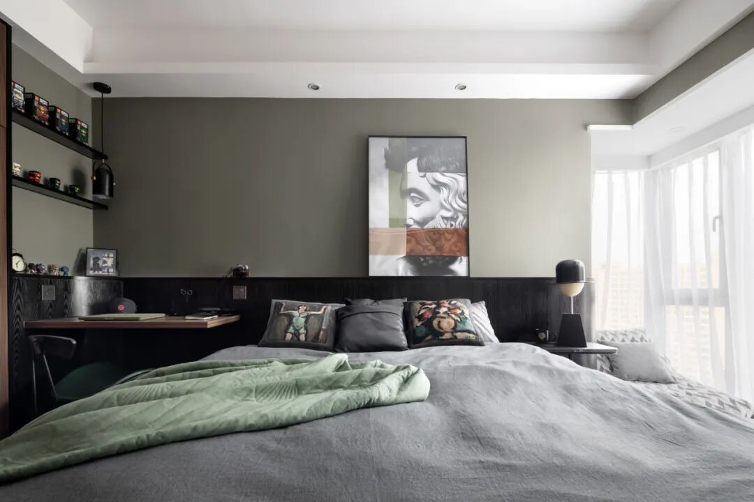主卧空间,以简约的设计手法构筑纯粹的生活情境。活泼优雅的灰绿色作为主色调引导空间情绪,“线”与“形”的元素贯穿整个场域,设计师用Photoshop软件加工制作的装饰画营造和谐的空间色调,又体现空间的设计美感。