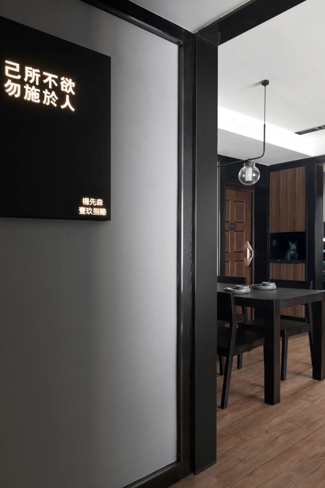 过道空间是“动”“静”两个空间的衔接,由此在造型和色彩上要起到过渡作用。设计师设计定制的壁灯外形简洁,质感磨砂,将文字的妙趣带入实用性,彰显居室格调,营造出舒缓的空间韵律与节奏,隐现设计美感。