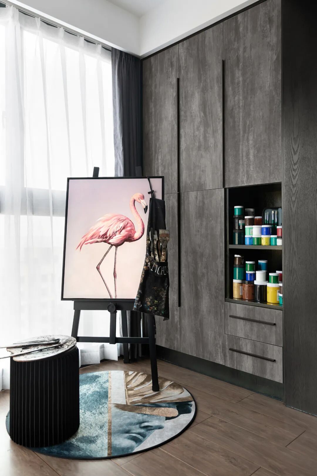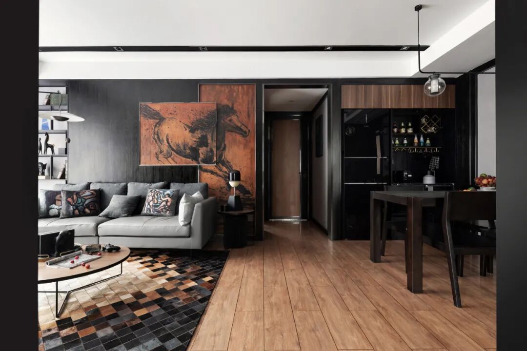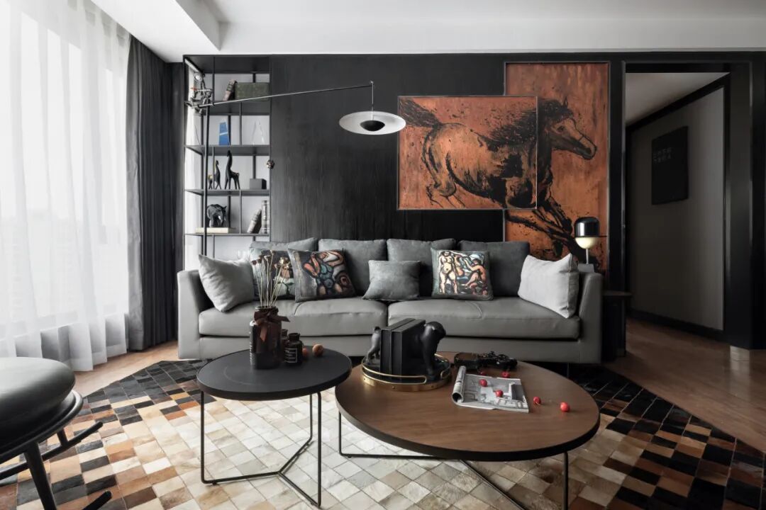 客厅空间摈弃了繁复的装饰,以细节放大我们的感受与空间想象。黑白灰的基调搭配胡桃木,格调又经典。在表象的视觉之下,设计师极尽克制,投射出空间的美学与艺术的张力。设计师亲手绘制的墙绘在整个空间中既有点睛之笔又有“马到功成”的寓意。