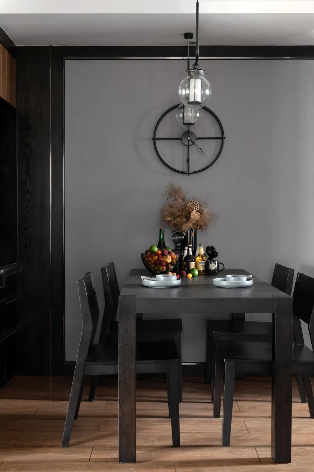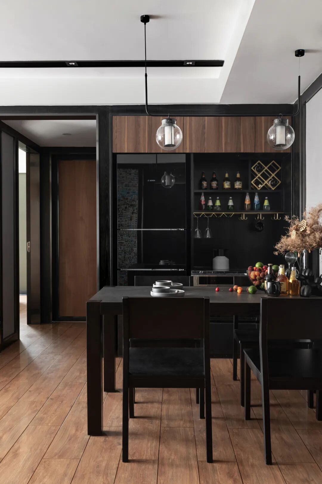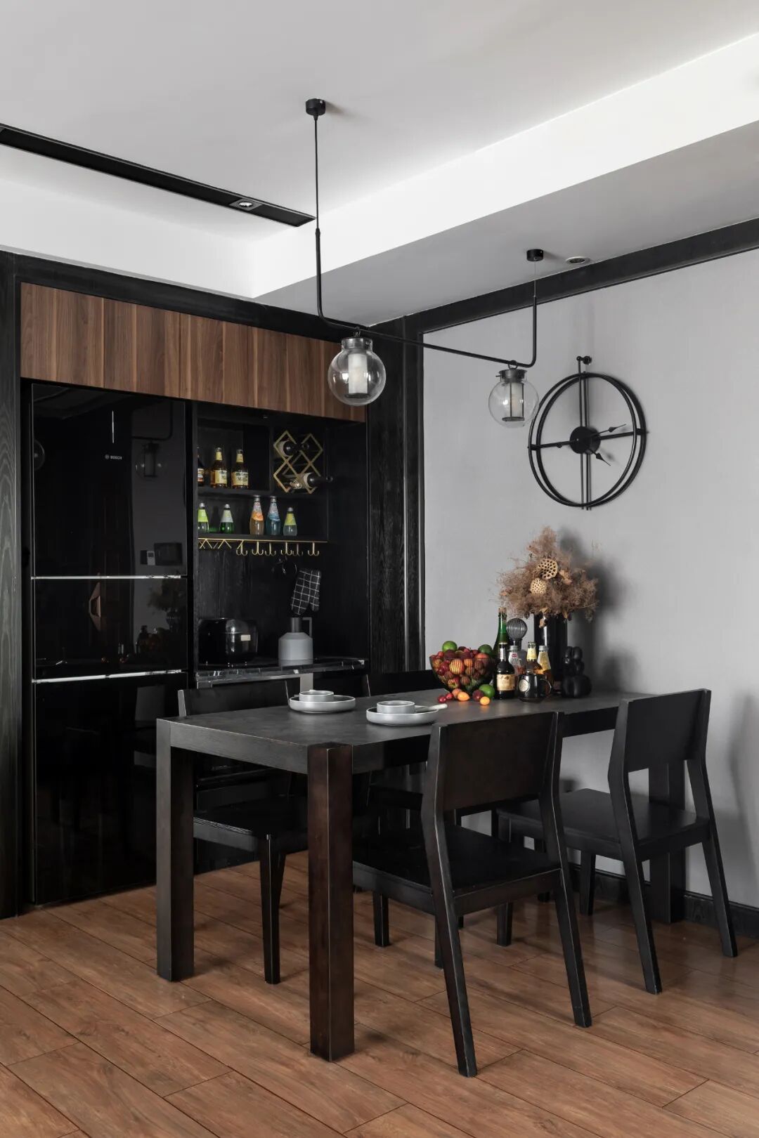 餐厅空间与客厅空间相结合的设计手法,既可以延伸多维度的视角,又可以让整个空间多元灵动,,把冰箱和一些厨房的电器设计在餐桌旁,既能让偏小的厨房空间宽敞,也能让就餐更加方便