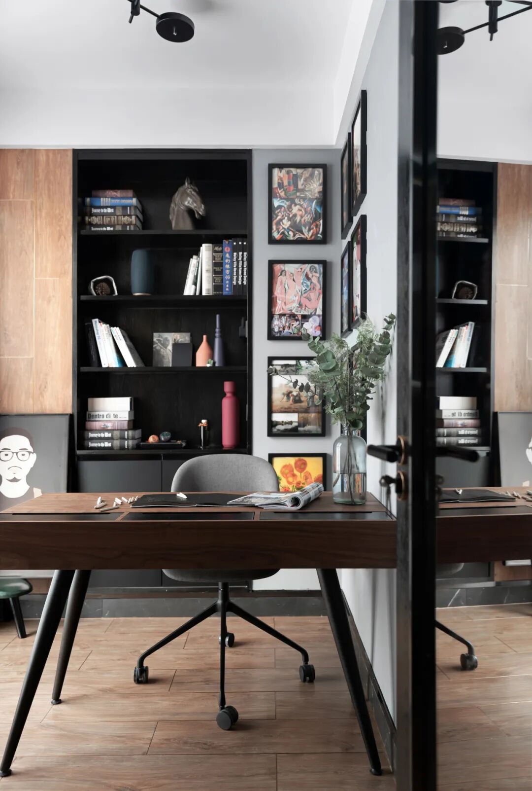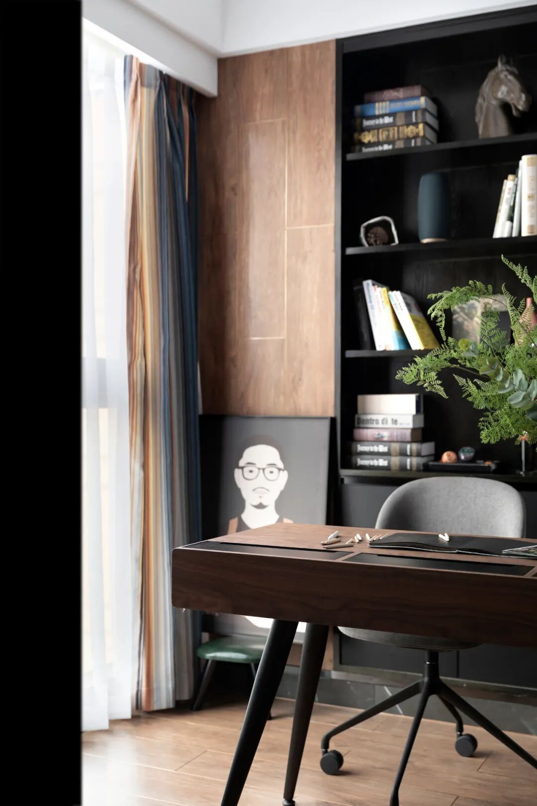 书房延续了黑白灰配胡桃木的简约基调,达到以简胜繁的效果,简单的一桌一椅一柜呈现出舒适清爽的空间氛围,增加了空间通透性和趣味性。幽幽绿植,传达着生命的活力与艺术的肌理。
