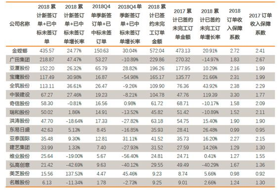 我们将装饰行业各公司2017Q1至2018Q4共8个季度的累计订单数据和订单保障系数进行汇总计算,得到行业层面各季度的累计已签约未完工订单规模和行业层面的订单收入保障系数。可以发现,18年各季度在手订单规模均较17年同期有不同幅度提升,说明行业层面在手订单情况较17年整体有所进步,此外,18年各季度订单收入保障倍数较17年同期也均有小幅提升,行业层面的业绩转化有望得维持。