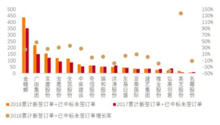 根据天风证券研究所的统计数据,2018年装饰装修行业上市企业的新签合同额如下所示:
