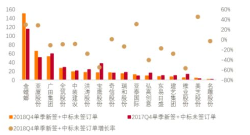 图4:装饰行业公司2018Q4 单季新签合同额(亿元)及增长率