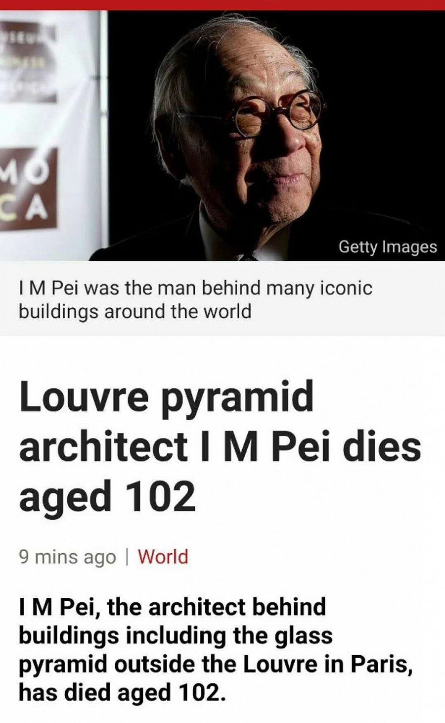 沉痛消息!美国当地媒体报道,享誉世界的华裔建筑大师贝聿铭5月16日去世,享年102岁。