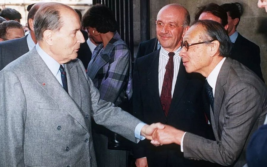 1989年,卢浮宫金字塔的开幕仪式上,美籍华裔建筑师贝聿铭(右)与当时的法国总统Francois Mitterrand 握手。