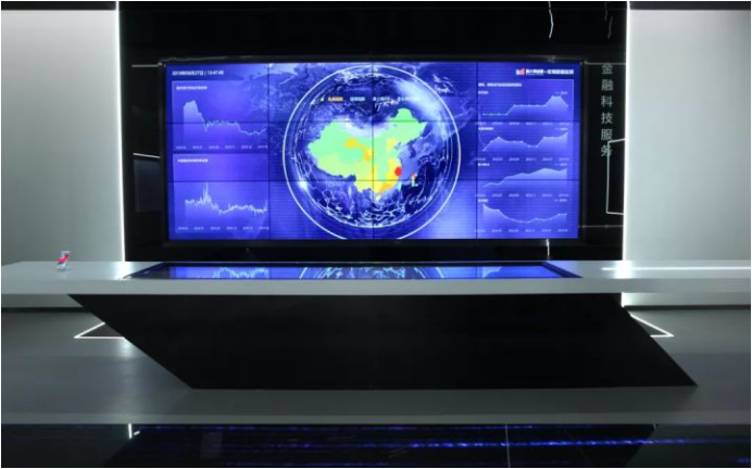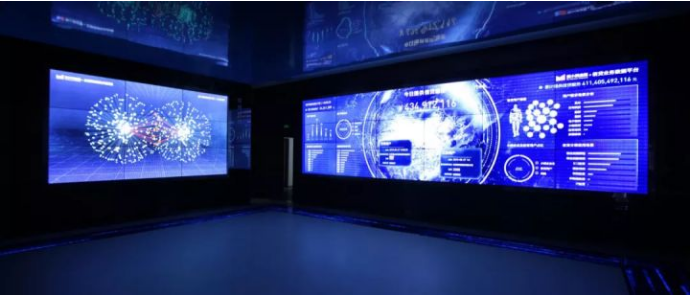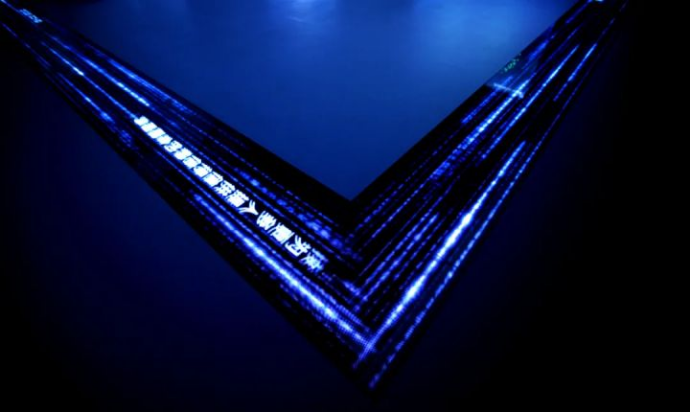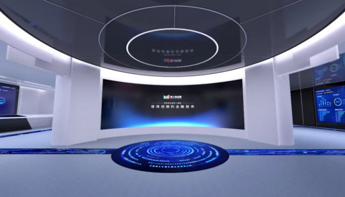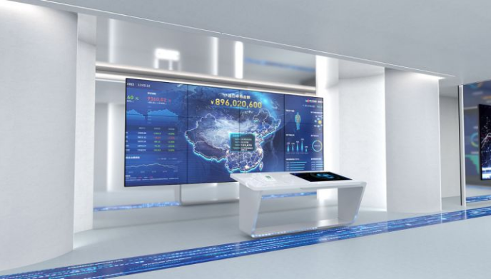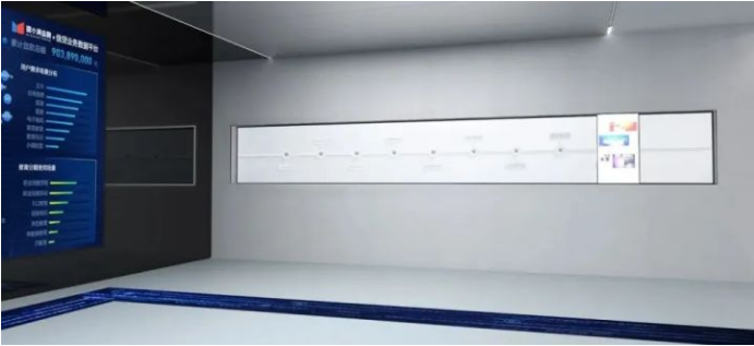 序厅的立面屏与地面的圆形屏以及贯穿整个展厅的地面流体屏呼应成极巧妙的整体,使参观者能够感受到立面屏水滴滴落、圆形地面屏水落涟漪、地面流体屏 由“信息流、科技流”升华为“普惠之河”,贯穿展厅、循环不断的过程以及流畅递进的设计。