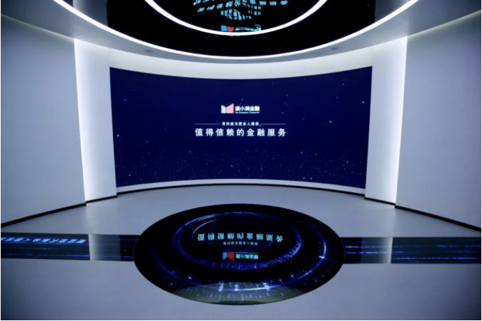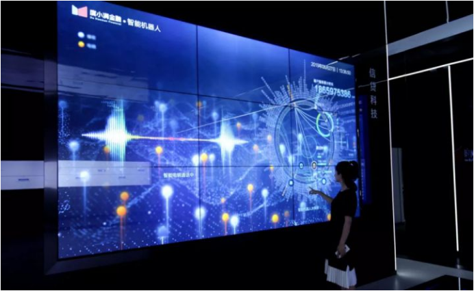 参观者跟随“普惠之河”的动向来到第二部分信贷科技展区。该展区分为两个板块,第一部分为信贷业务数据平台,第二部分为信贷科技。信贷业务数据平台以3*6的液晶显示屏展示度小满的相关信贷业务数据。信贷科技以3*3多人多点触摸液晶显示屏承载,充满科技感的动态屏保展示着本展区“智能获客”、“智能风控”及“智能机器人”的三部分内容。信贷科技展区通过两部分内容,精准完整、层次分明的展示了度小满金融的信贷能力以及百度的AI能力。