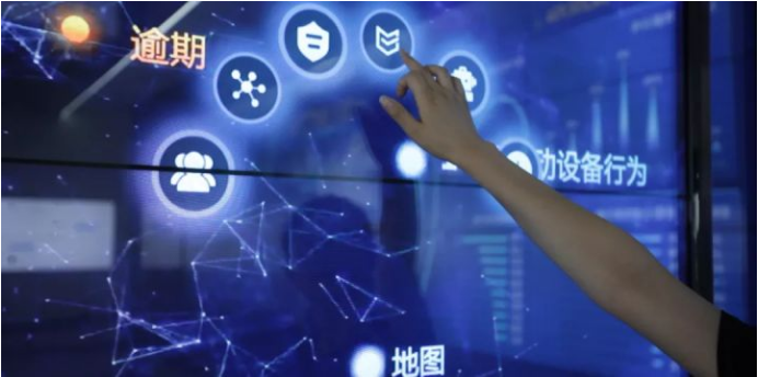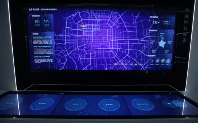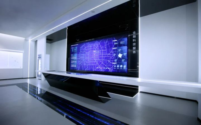 顺着“普惠之河”继续前行,呈现在眼前的是第五部分金融科技服务展区。该展区为3*4液晶显示屏+43寸*3触摸台组成的“隔空甩屏” 。