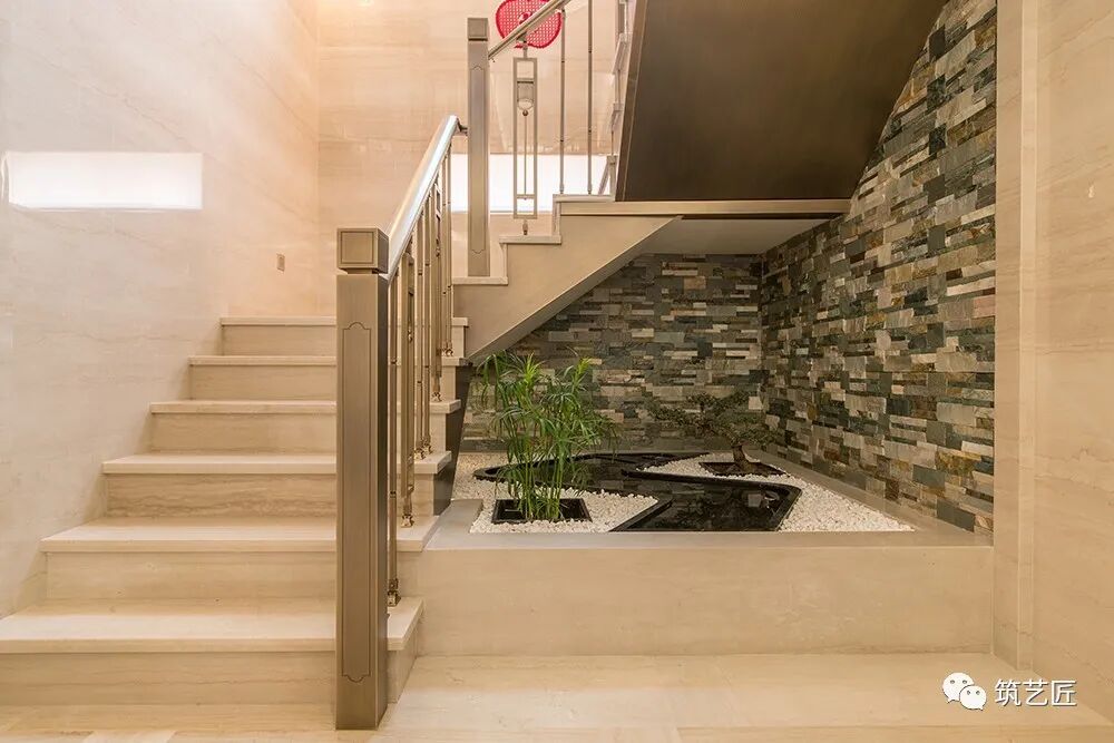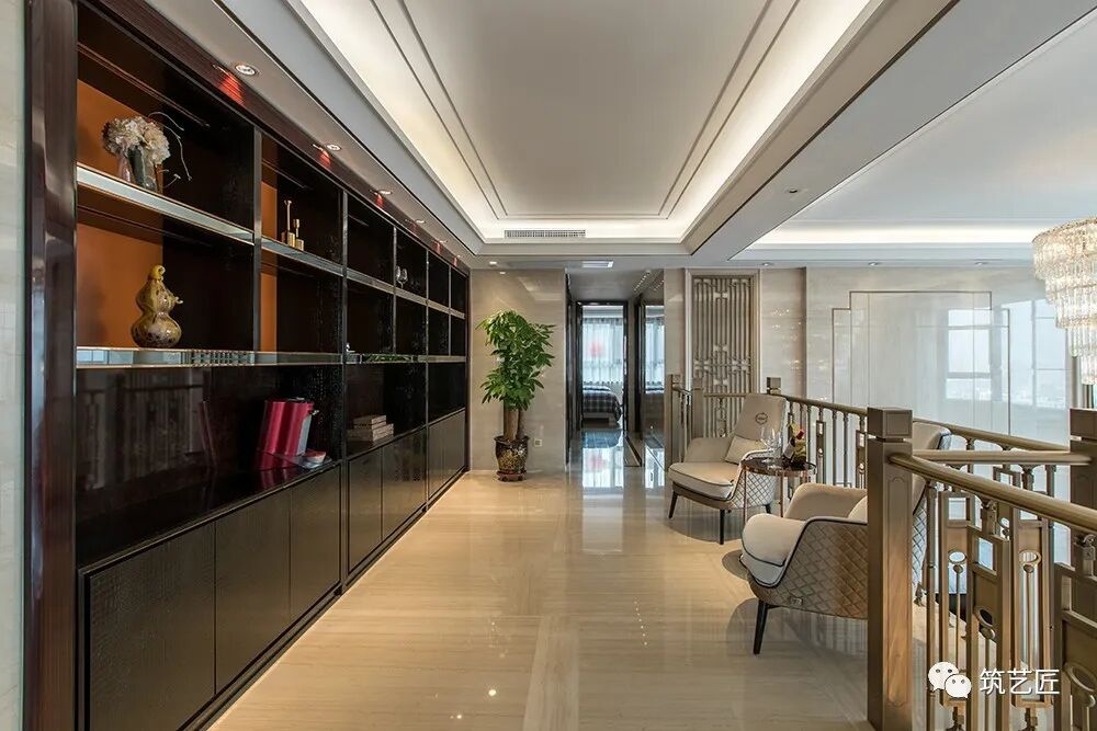 过道内嵌入墙体的置物柜,与地面形成视觉的延伸,令空间得到更好的释放,围栏简约的线条,搭配米白色的座椅及金属质感的休闲桌,营造出一种复古的情调,倒一杯红酒、品读一本好书,或是会客,享受自在的休闲时光。