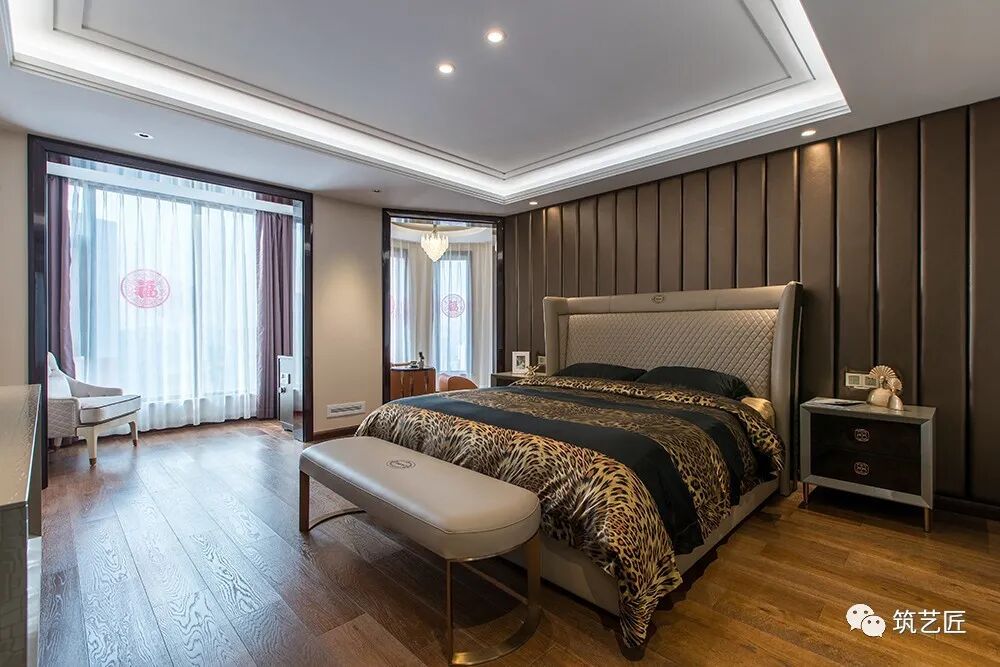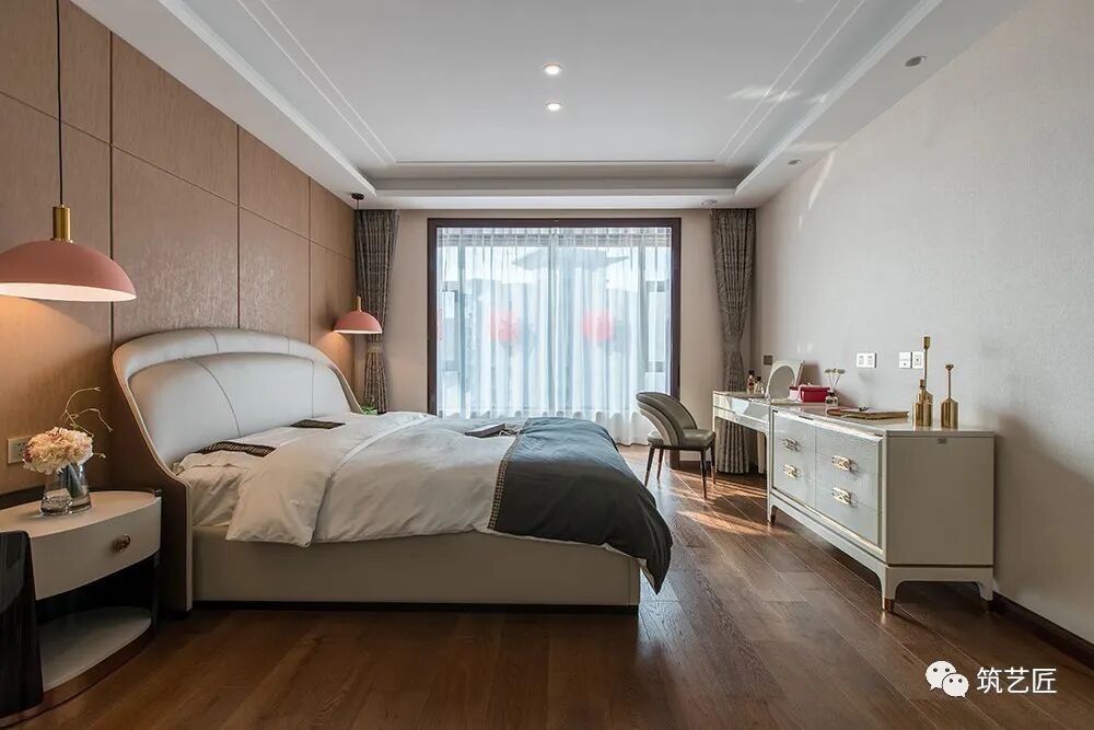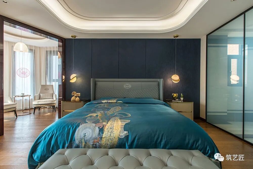 主卧的落地大窗带来的充足的采光,让空间通透且开阔;莫兰迪蓝平和而沉稳,墙面及床头的搭配,皮质的床头与丝绸质地的床品无不散发出优雅与舒适之感;奶白色的沙发凳与金属质感小茶几的搭配,让整个房间极具轻奢雅致的格调!