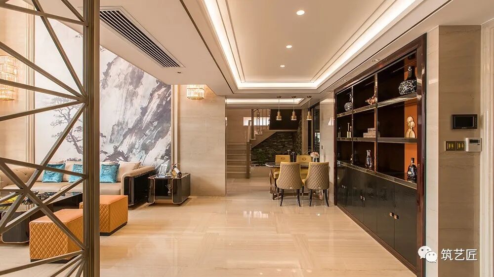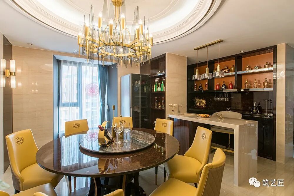 餐厅使用了黄色系的色彩搭配,米黄、姜黄、木色等彰显出餐厅的温暖和雅致;酒柜同时连接着厨房吧台,烘托出圆形的餐桌椅,复古的吊灯,点映出空间的温馨格调。