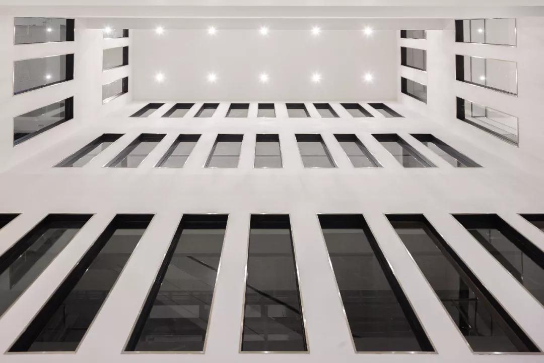 在室内,设计师特意打造了一个贯通一到四层的内中庭,把建筑的外立面窗格做在室内,让人们在室内感受室外的建筑感,并且在扶梯的上升过程中能感受一到四层不同的空间美感。