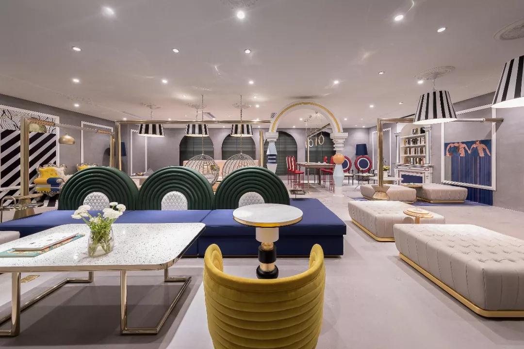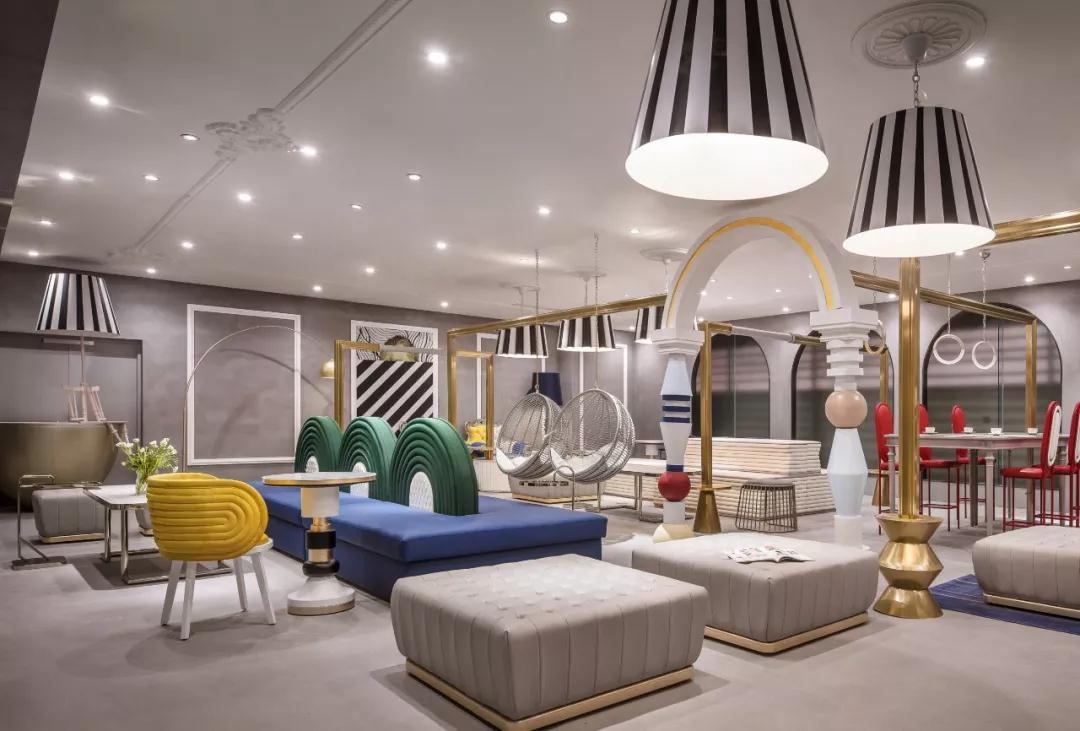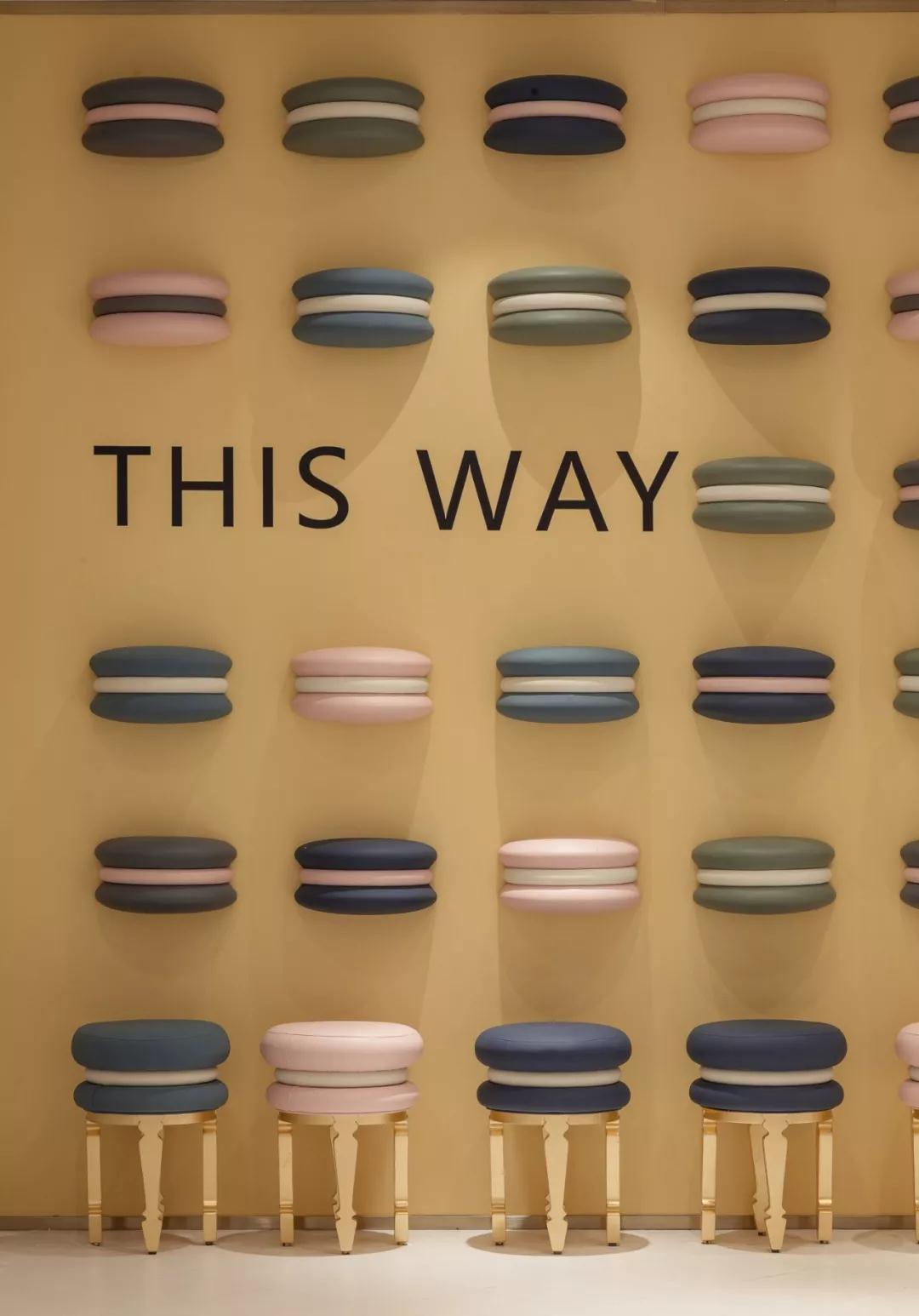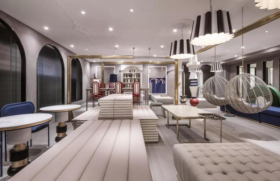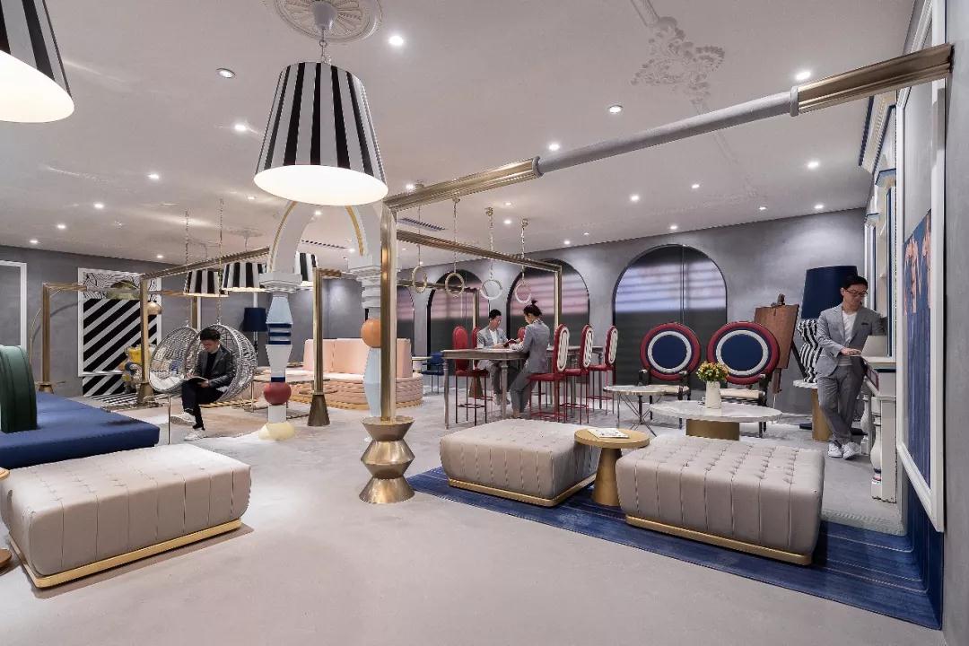 动静分离的布置,一方面让视觉点更集中,一方面也便于后期的运营管理。从主大堂扶梯上来,首先看到的是work hard 的欢迎橱窗,然后转身会看到一个特别怪诞、艺术的公共客厅。
