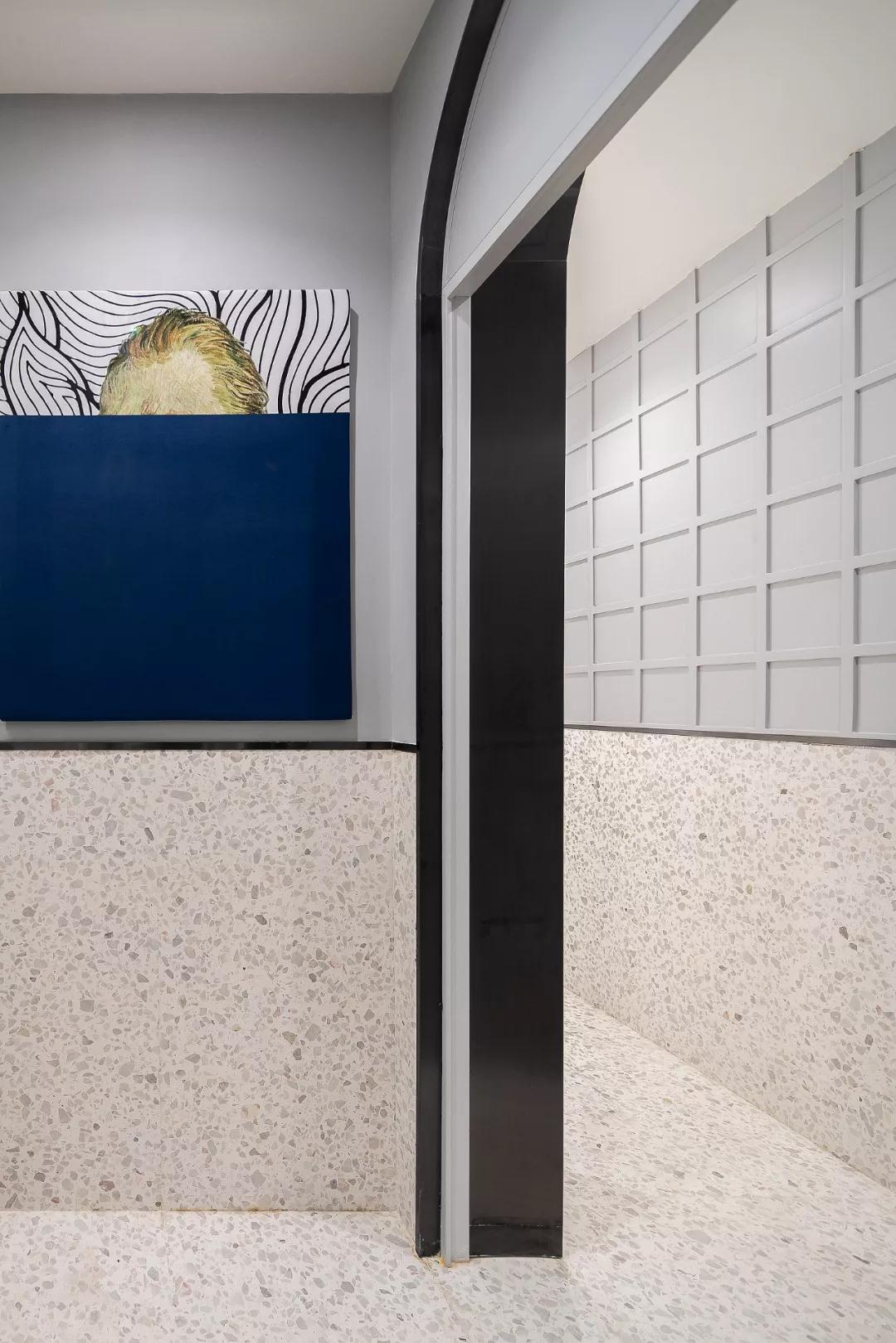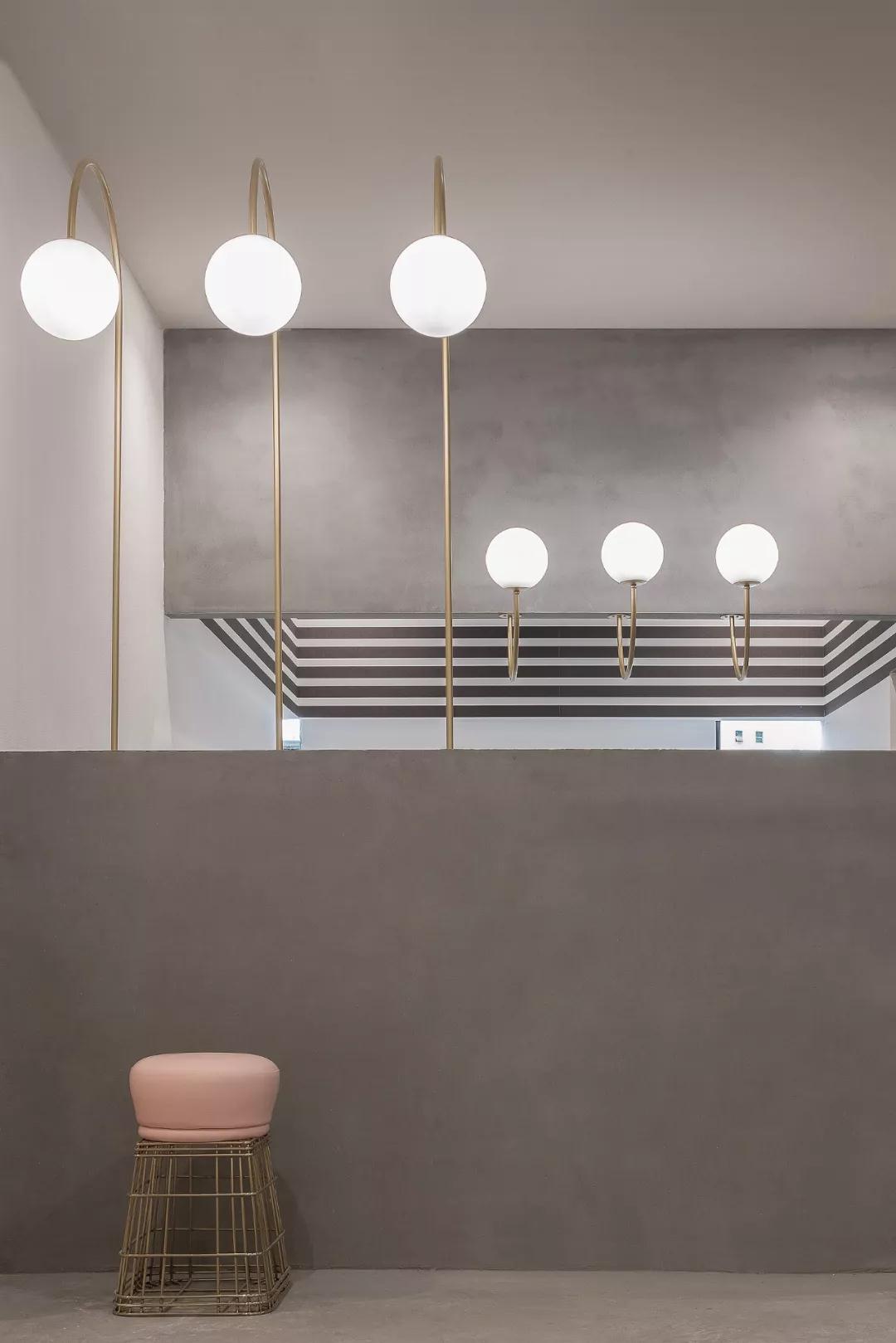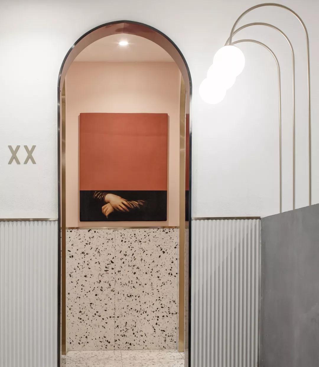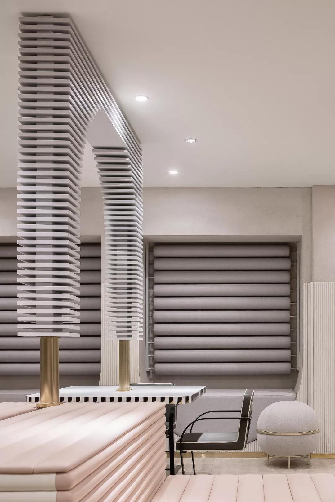 在这里,设计师引用了健身器械的元素进来,想要传达健康工作的理念。将单杠吊环意化成巨大的香槟金画框,当你穿梭其中就像置身于一幅幅画作当中。