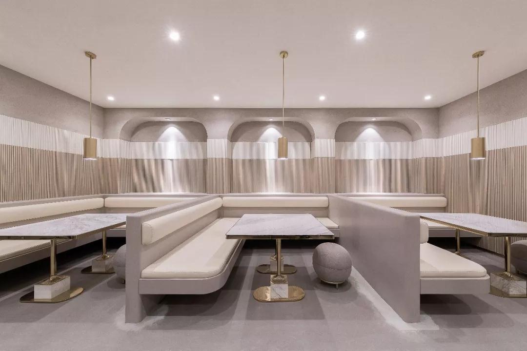 客厅区域依然采用多种的座位形式满足不同的需求,公共的水吧空间也融合在这里,同时设置相应的私密休息空间。因为针对的客群的不同,在调性上偏成熟稳重,在空间里运用比较多的木饰面和灰粽色的混凝土饰面。