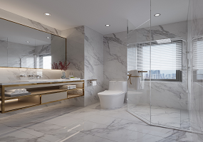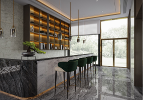 项目主材: 黑木纹石、皮革、墙布、米黄石材、鱼肚白石