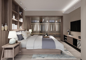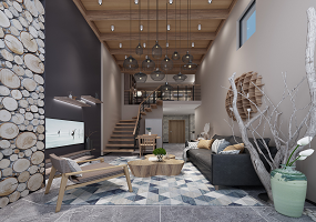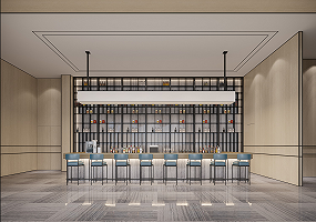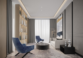 项目主材: 蓝木纹石材、黄杨木、软膜、灰钢