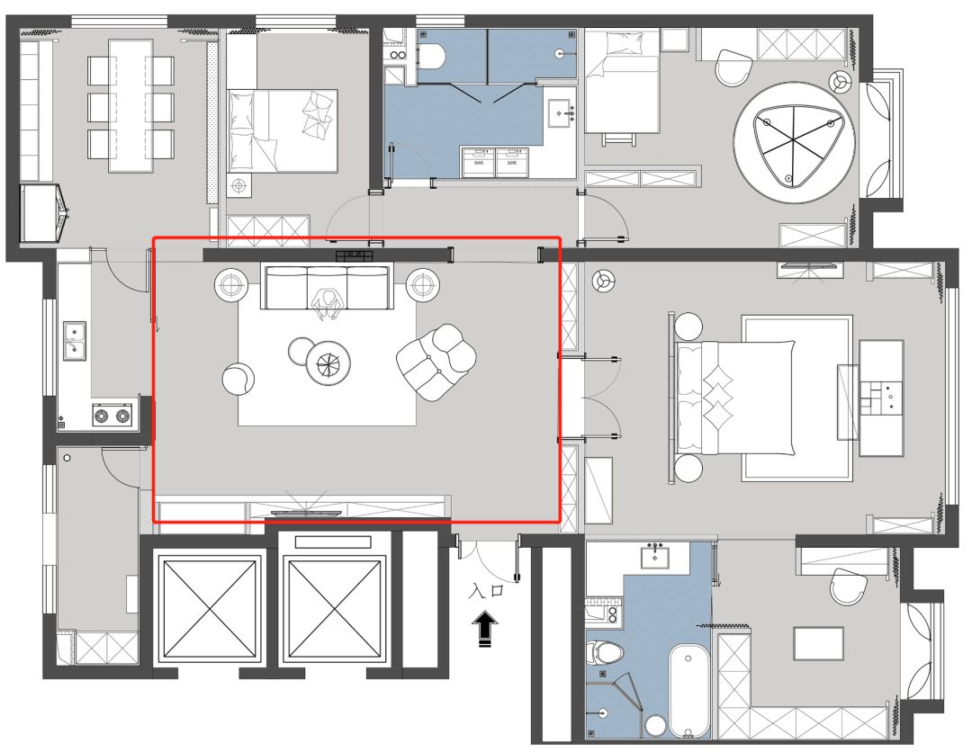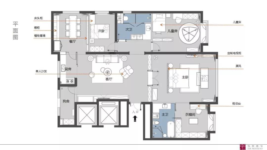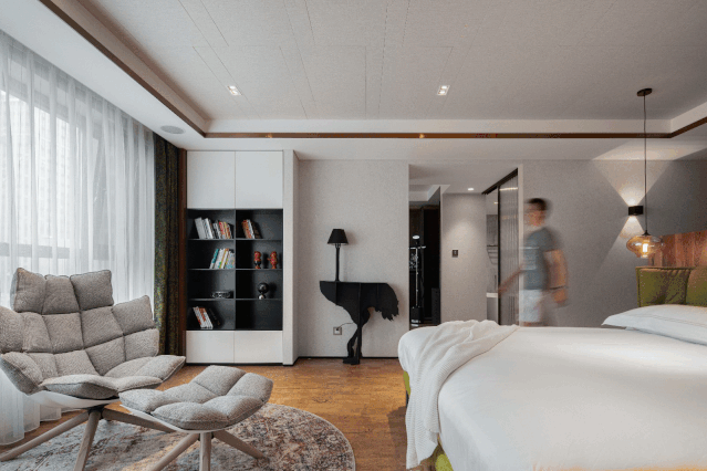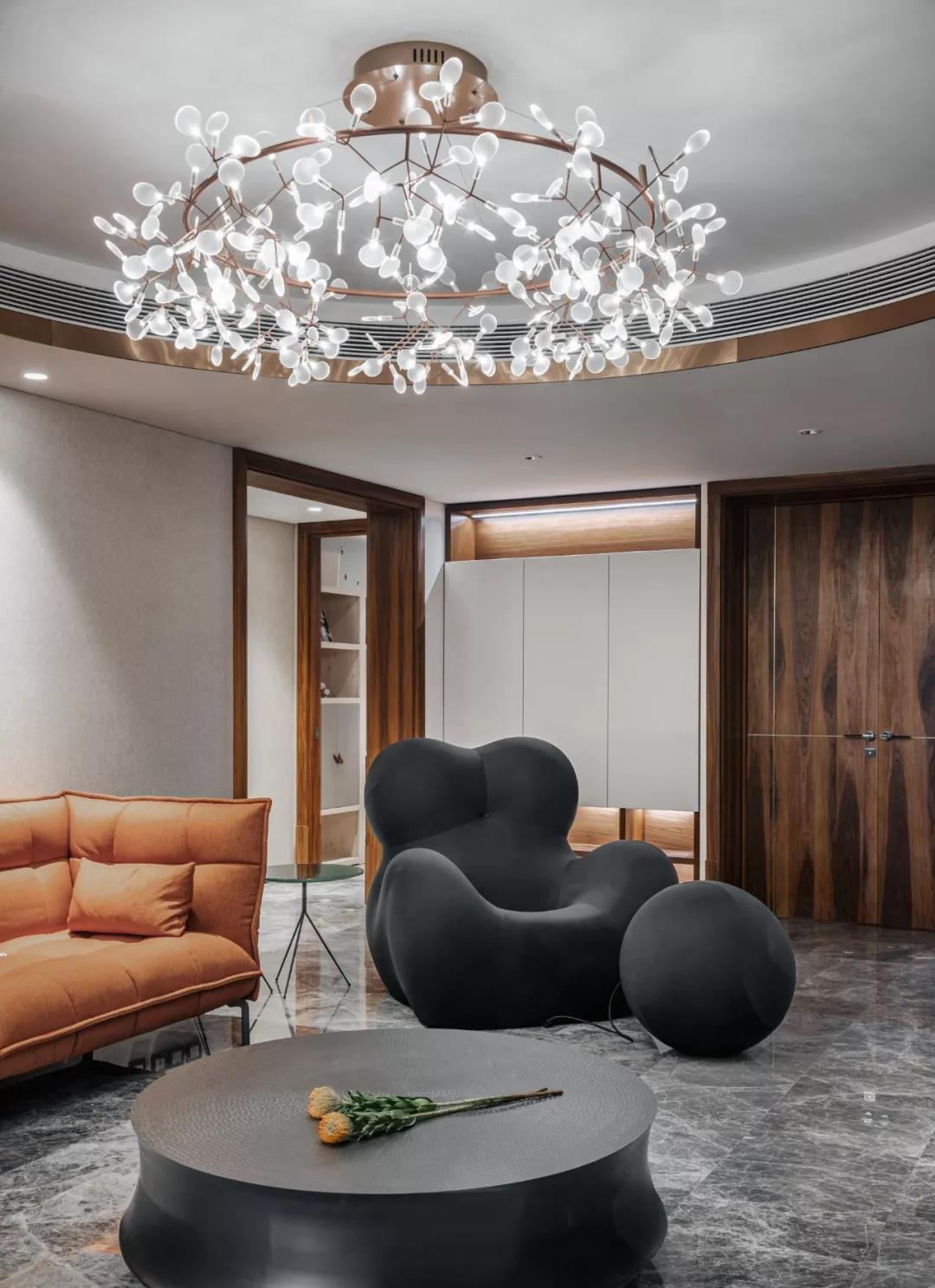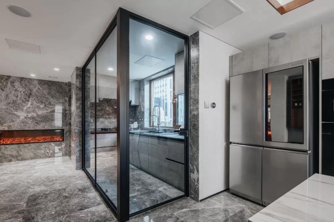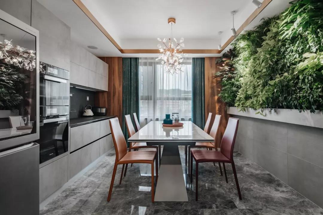 项目简介 Project Description 让你的生活,有故事可讲。设计思维不凌驾于风格,而取决于生活方式,打破户型传统布局,重新定义生活空间,看设计师的神级操作。住宅类型:第一居所,居住成员:一家三口、保姆、金毛,业主需求:简约时尚略有书香气息,增加智能设备原户型分析: 1、主卧室分区面积不够,影响品质; 2、客餐厅分区不合理。北侧阳台影响采光,以客餐厅分隔动静区域影响后期使用。3、厨房形状与位置不利于空间使用。此户型优点:全明设计,阳光充足,主要空间面宽开阔。改造后:1、原户型的客厅与西侧一间次卧合成现在的主卧大套间,空间更宽敞,动线更简单实用,保留了落地窗大面积观景区域;2、原户型的主卧为现在的儿童房,儿童房的空间更加开阔,功能更加全面3、客厅位置离入户门更近,便于提高业主今后对客厅的使用率4、餐厅位置选择了东北角的独立空间,配合植物幕墙的使用,使餐厅更具仪式感,符合年轻人的生活方式。客厅原客厅餐厅连为一体,分区不合理,北侧阳台影响采光。改造后,客厅餐厅分别独立,动静区域分隔更为合理。吊顶的圆形造型与吊灯和圆形茶几呼应,更具整体性。电视柜旁的壁炉灯使空间更加温馨,增加了大理石瓷砖类材料的空间感官温度。